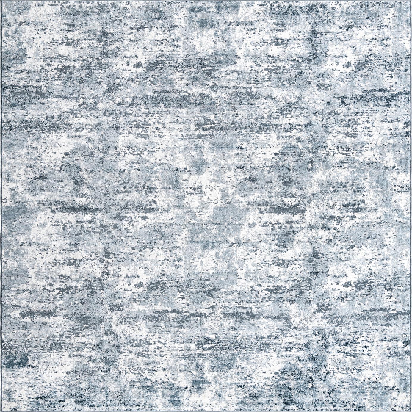 A soft, painterly abstract pattern floats across a vintage blue ground, layered with gray and ivory accents that create a gently weathered, contemporary look. The distressed motif moves subtly across the surface, offering visual depth without a strong border or repeat. Machine-made from 100% polypropylene, the rug has a low-profile pile with a smooth, slightly lustrous hand that feels comfortable underfoot while maintaining a refined, even surface.