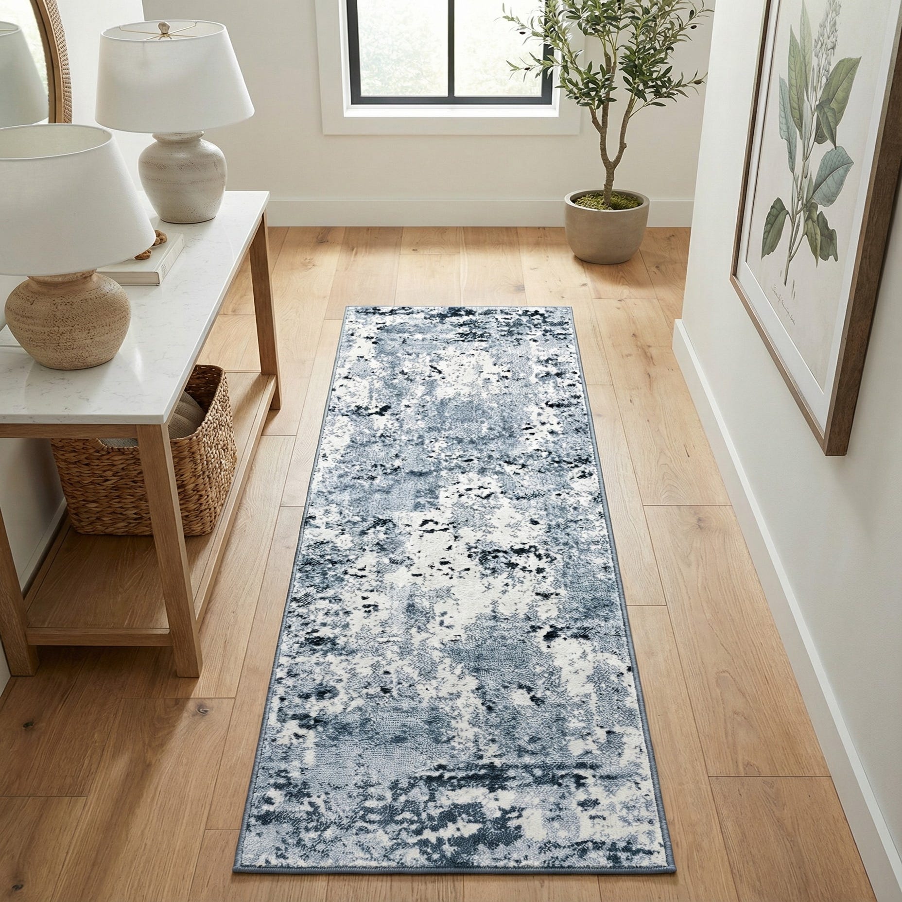 Machine-made from 100% polypropylene, this runner pairs practical resilience with a relaxed, contemporary aesthetic. Its palette and pattern work well in coastal, modern, or transitional interiors — try it in a hallway or entry, alongside a light-wood console, at the foot of a bed, or down a galley kitchen to soften hard surfaces and connect adjacent spaces. The vintage blue background and neutral ivory and gray highlights make it easy to coordinate with both cool-toned and neutral furnishings.