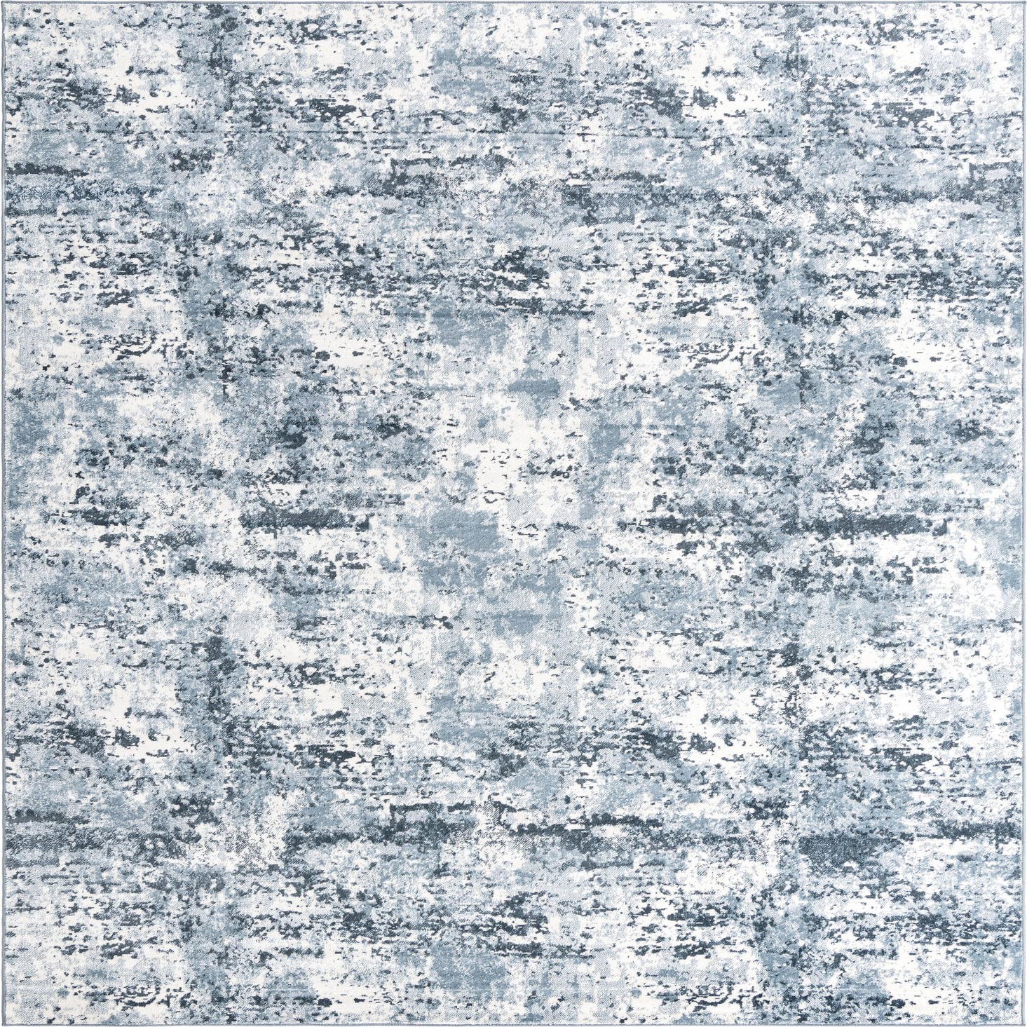 A soft, low-pile rug with a painterly, distressed pattern, this piece pairs a Vintage Blue ground with layers of Gray and Ivory that create a cloud-like, timeworn effect. The abstract motif reads as a contemporary take on traditional fading, with scattered speckling and subtle striations that give the surface depth and movement. Machine-made in 100% polypropylene, the weave has a smooth, slightly cushioned hand underfoot and a restrained sheen that catches light without dominating a room.