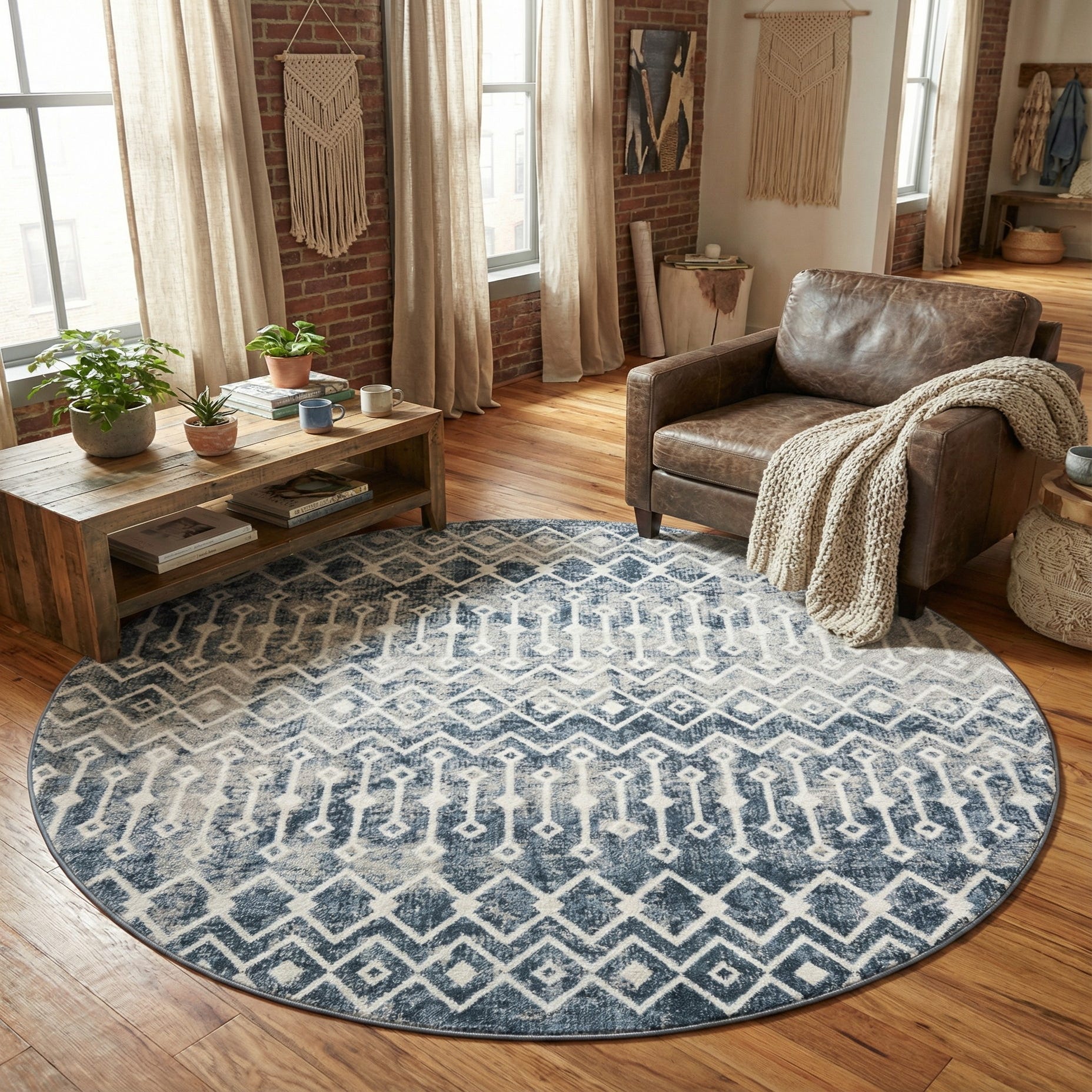 Use this round rug to define a dining nook beneath a circular table, anchor a small seating area, or add a soft focal point at the foot of a bed. It works well in casual contemporary, coastal, Scandinavian, or modern farmhouse interiors—pair it with light woods and linen upholstery for an airy look, layer with textured throws and brass accents for warmth, or keep surrounding textiles in muted grays and ivories to maintain a calm, cohesive palette.