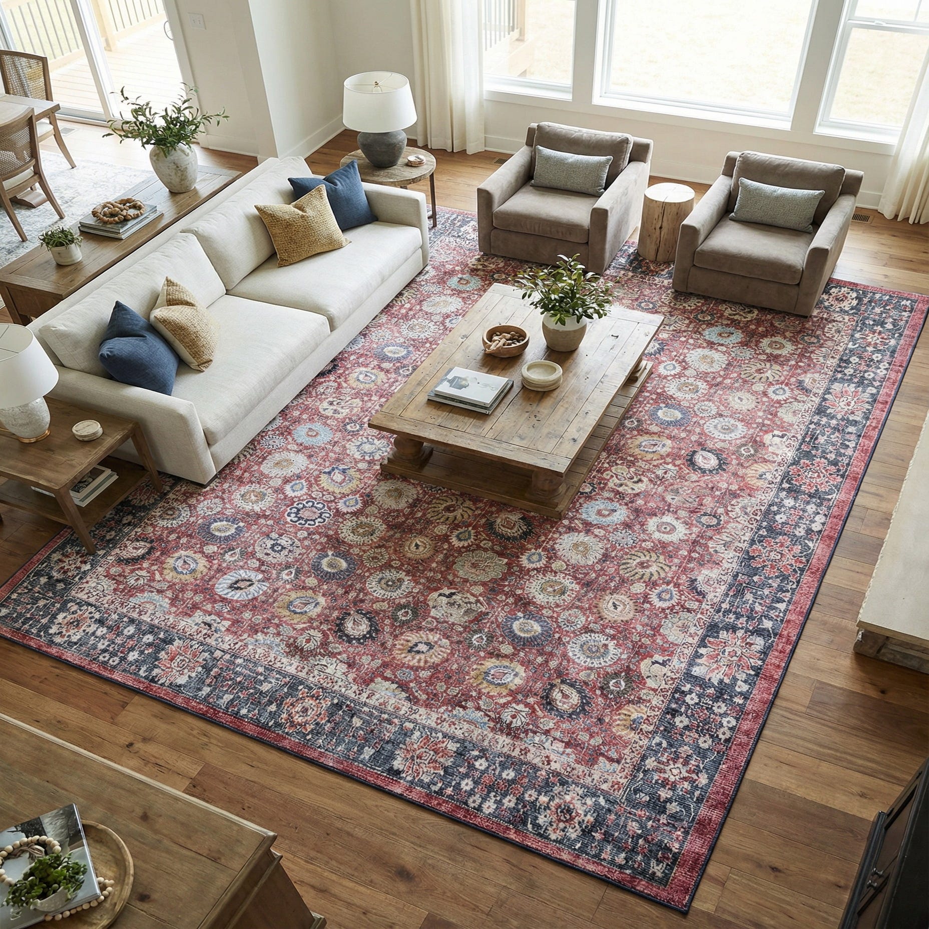 A 10x13 rectangular vintage red traditional rug with a detailed floral medallion pattern and a dark navy border, suitable for a living room.