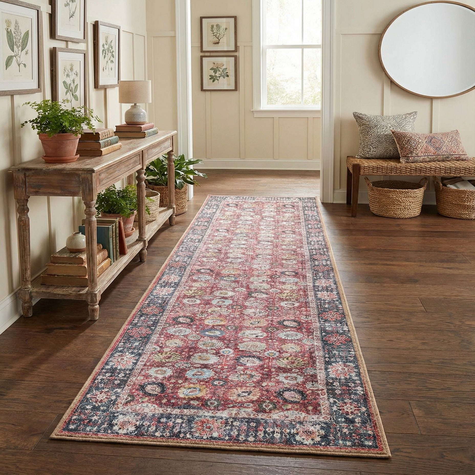 A 12 ft runner rug in vintage red with a traditional floral pattern and a dark border, ideal for a hallway.