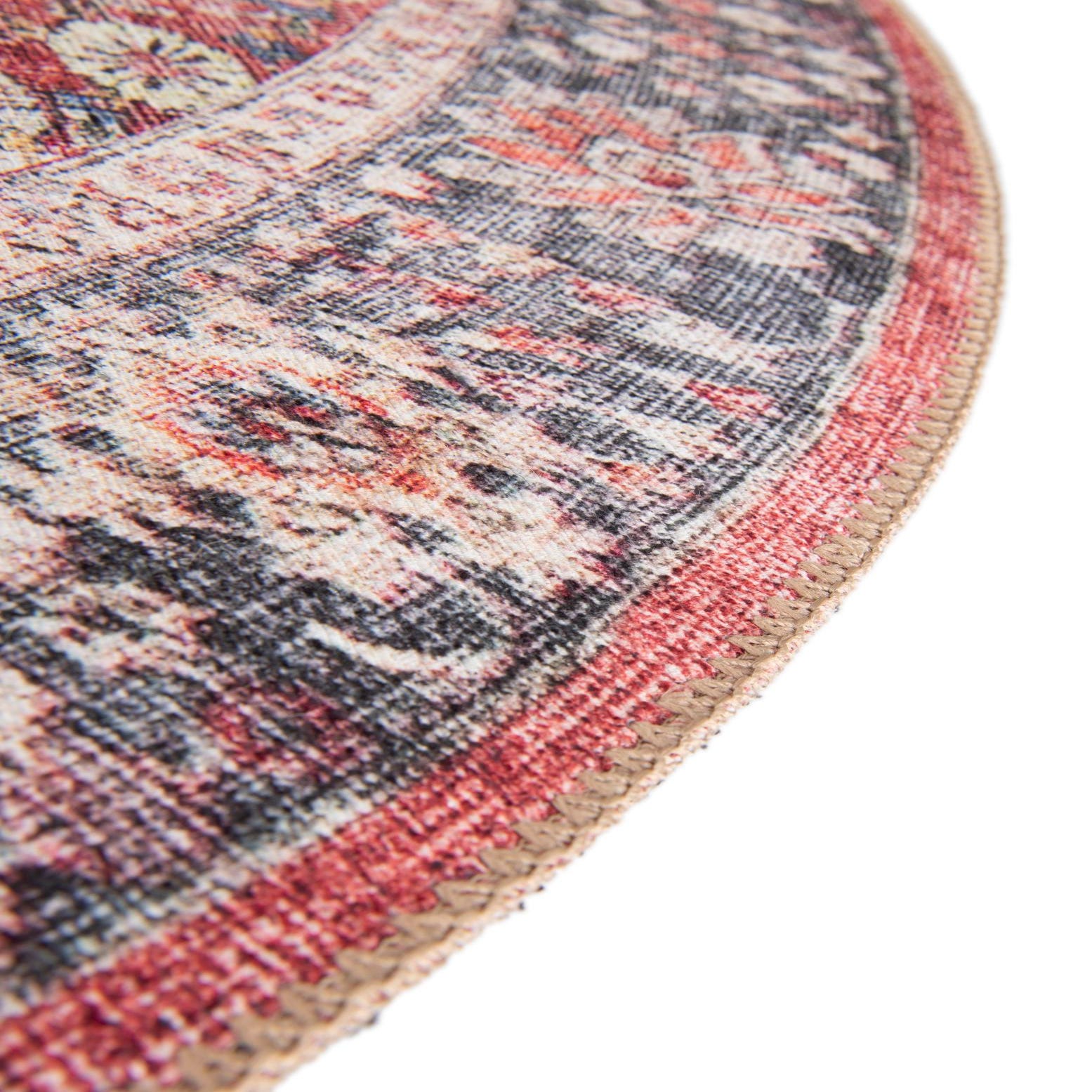 A vintage-inspired oval rug grounded in a rich Vintage Red field, this piece layers traditional floral medallions and paisley motifs in a warm palette of ivory, navy blue, blue, yellow, orange, brown and black. A darker navy/black border frames the center with smaller floral repeats, while a subtly distressed finish softens the contrasts and gives the design a lived-in, classic feel.