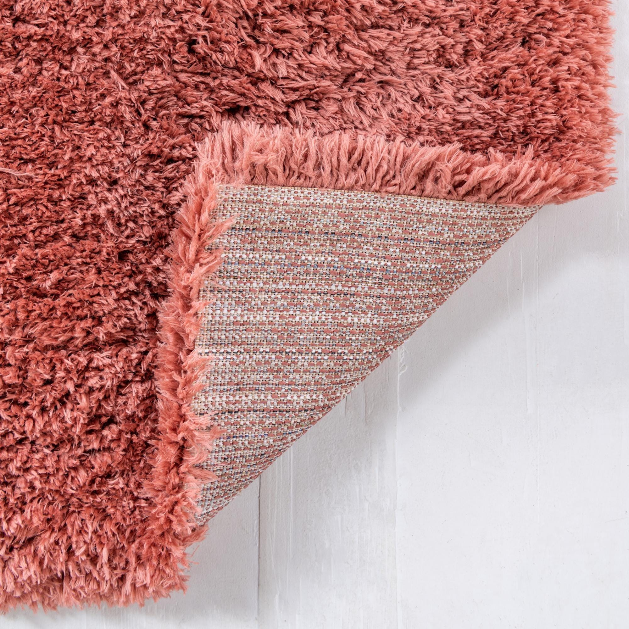 A long-pile shag in a warm Vintage Rose, this runner presents a solid field of color with a subtle, linear texture created by variations in pile direction and height. The soft, dense polyester fibers create visible striations across the surface that catch light differently as you move, giving the piece quiet depth without a defined motif. Machine-made construction keeps the pile consistent from edge to edge while preserving the plush, inviting look of true shag.