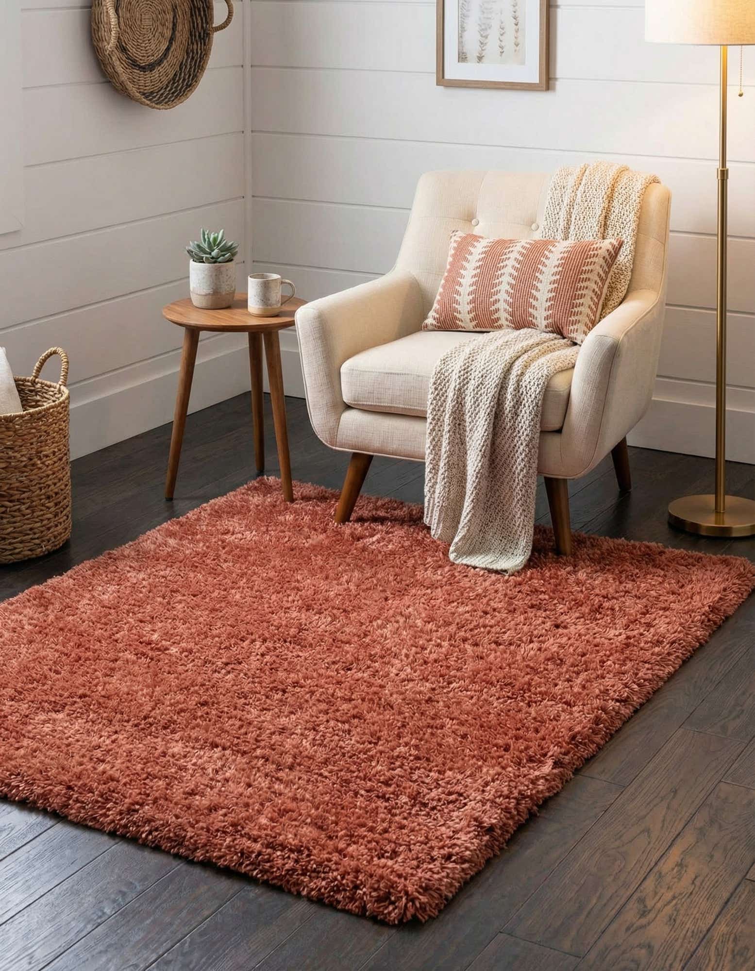 Run your hand across the fiber and you'll notice the cushioned, enveloping texture that invites bare feet and relaxed lounging. This piece works particularly well beside a bed, under a reading chair, or layered over a larger neutral rug to add warmth and color. Style pairings include contemporary and Scandinavian interiors for a soft contrast, boho spaces that welcome rich texture, or modern glam rooms where the rose tone complements metallic accents.