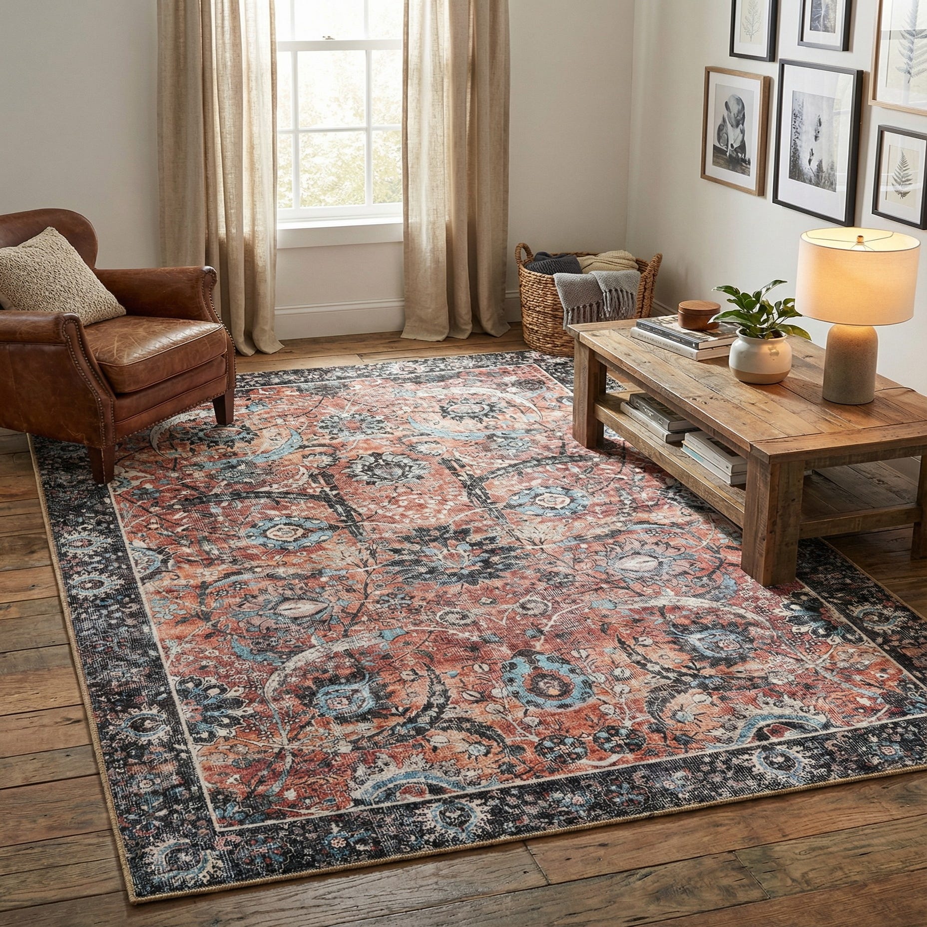 Primary color is Vintage Rust Red. Colors in this rug include: Vintage Rust Red, Beige, Black, Olive, Red, Ivory.
