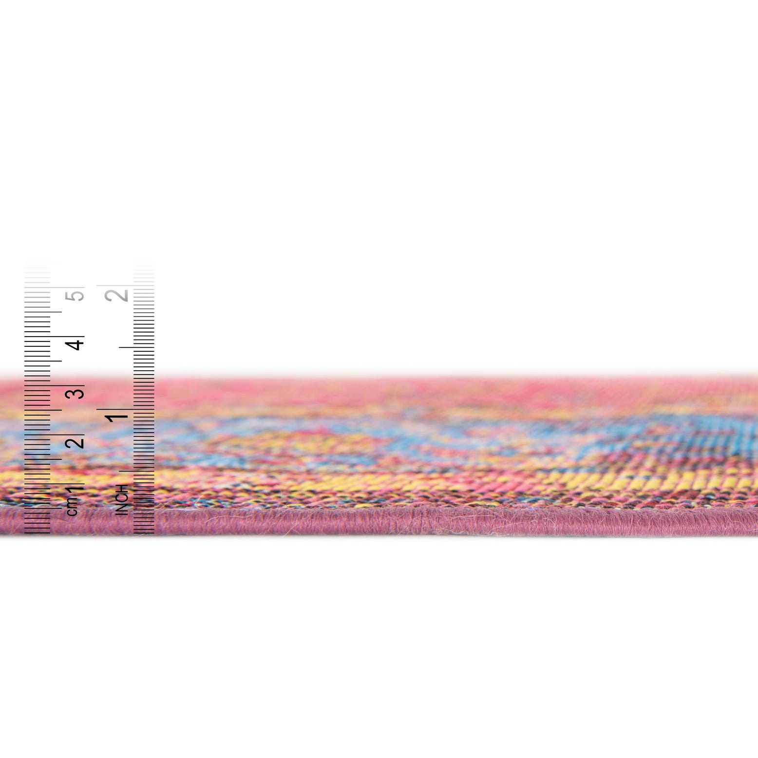 A 10'x10' square indoor/outdoor rug with a distressed traditional Oriental pattern in shades of pink, orange, and blue.