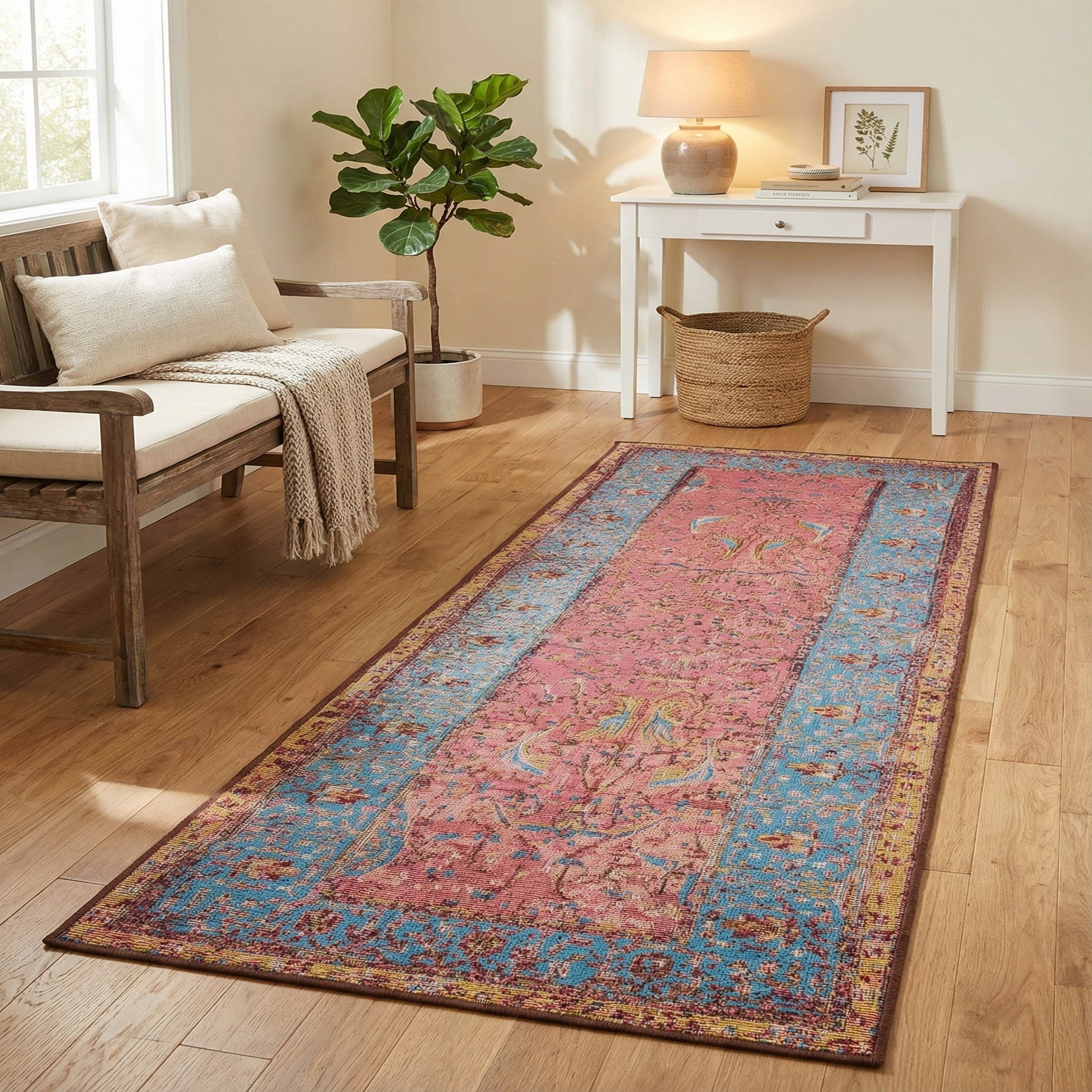 A worn-finish traditional pattern maps across a Vintage Salmon Coral field, with a narrow, bright Blue guard border that adds crisp contrast. Delicate vines, stylized blossoms and a faint central medallion are rendered in Beige, Brown and Yellow, with bits of Blue threaded through the design for pop and depth. The pattern has a vintage, distressed look that reads like a timeworn Persian runner, while the colors maintain a fresh, lively balance.
