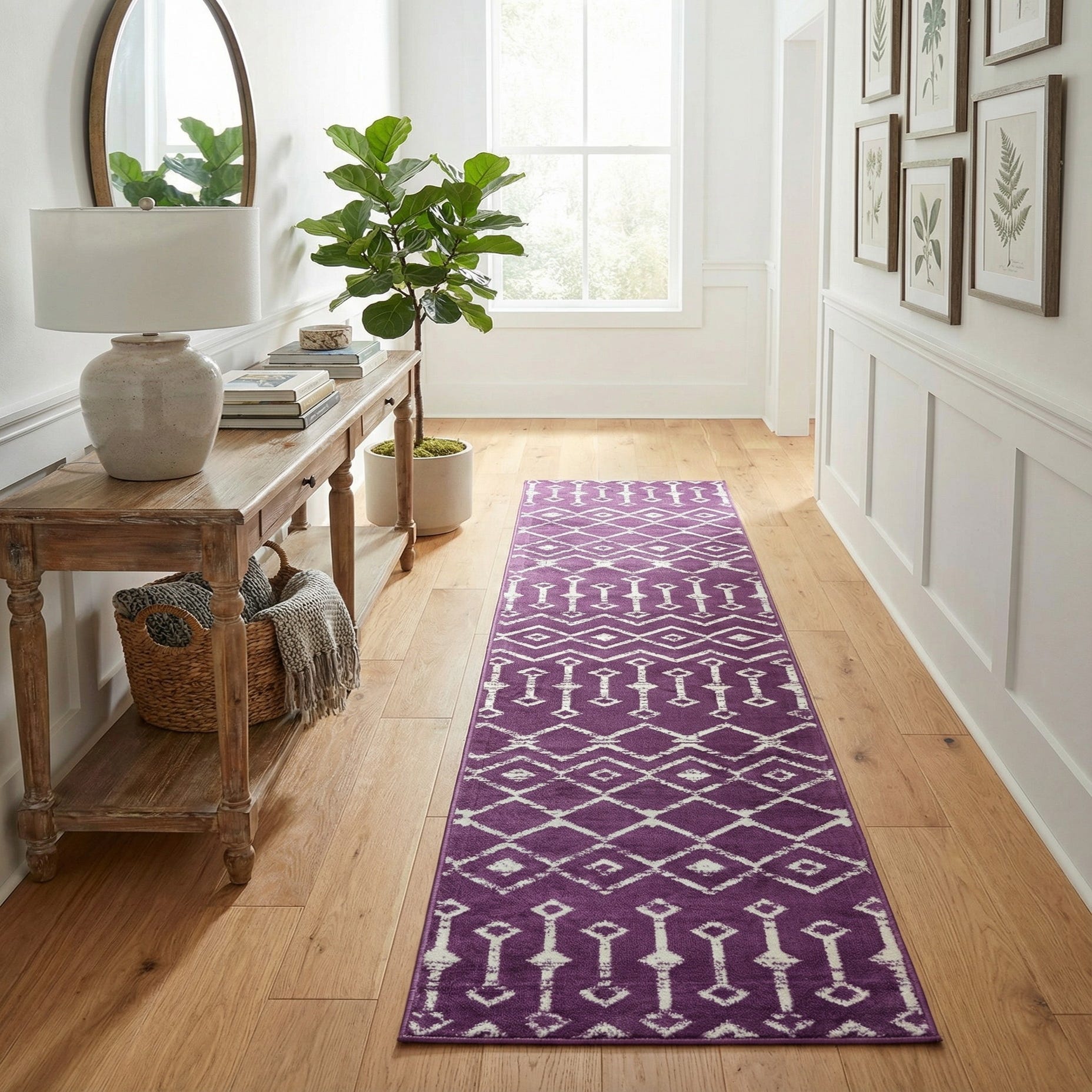A 10 ft purple runner rug with a white distressed tribal trellis pattern, ideal for a hallway.