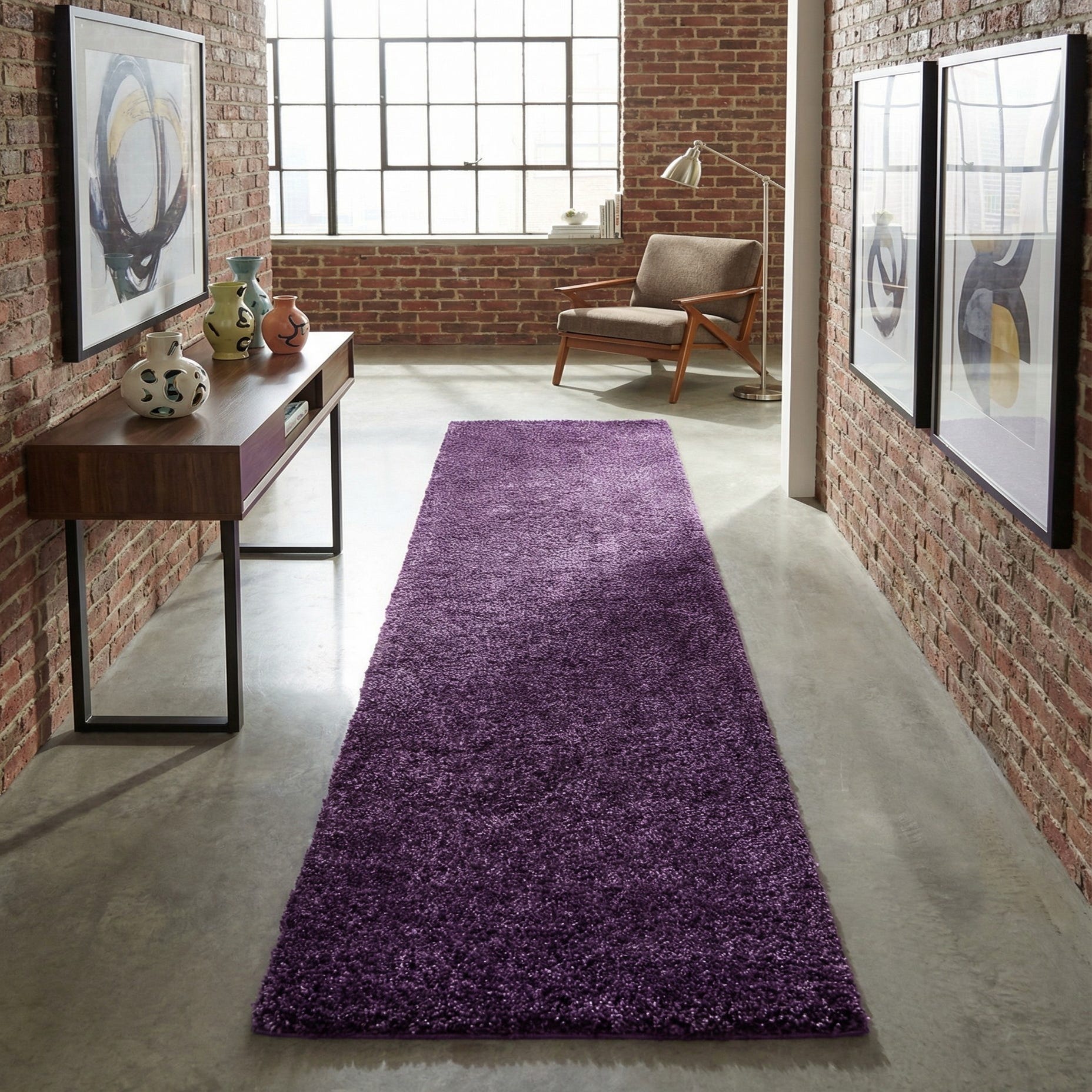A solid violet runner with a richly textured frieze pile, this machine-made rug is crafted from 100% polypropylene for color clarity and resilient performance. The surface is densely packed with high-twist fibers that create a slightly tousled, almost shimmery finish—no printed pattern, just an even, monochromatic field of violet that adds depth through fiber movement and light reflection. The pile feels plush underfoot while maintaining a structured, casual look that stays visually interesting from every angle.