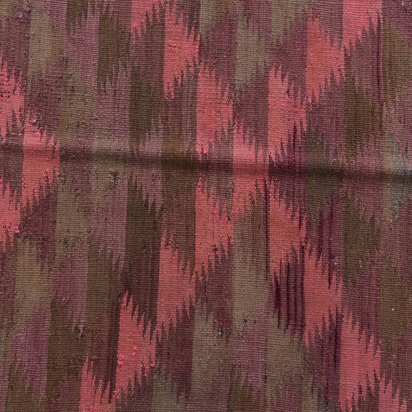 The Kilim Fars collection offers this hand-woven 12-foot runner crafted with 100% wool, presenting a durable and tactile surface. The rug showcases a vibrant violet background, harmoniously integrated with accents of brown, pink, and ivory. Traditional geometric patterns and a symmetrical arrangement provide an authentic kilim aesthetic. The rustic appeal is further enhanced by the naturally aged character, including repair marks and missing fringe, adding to its storied history.