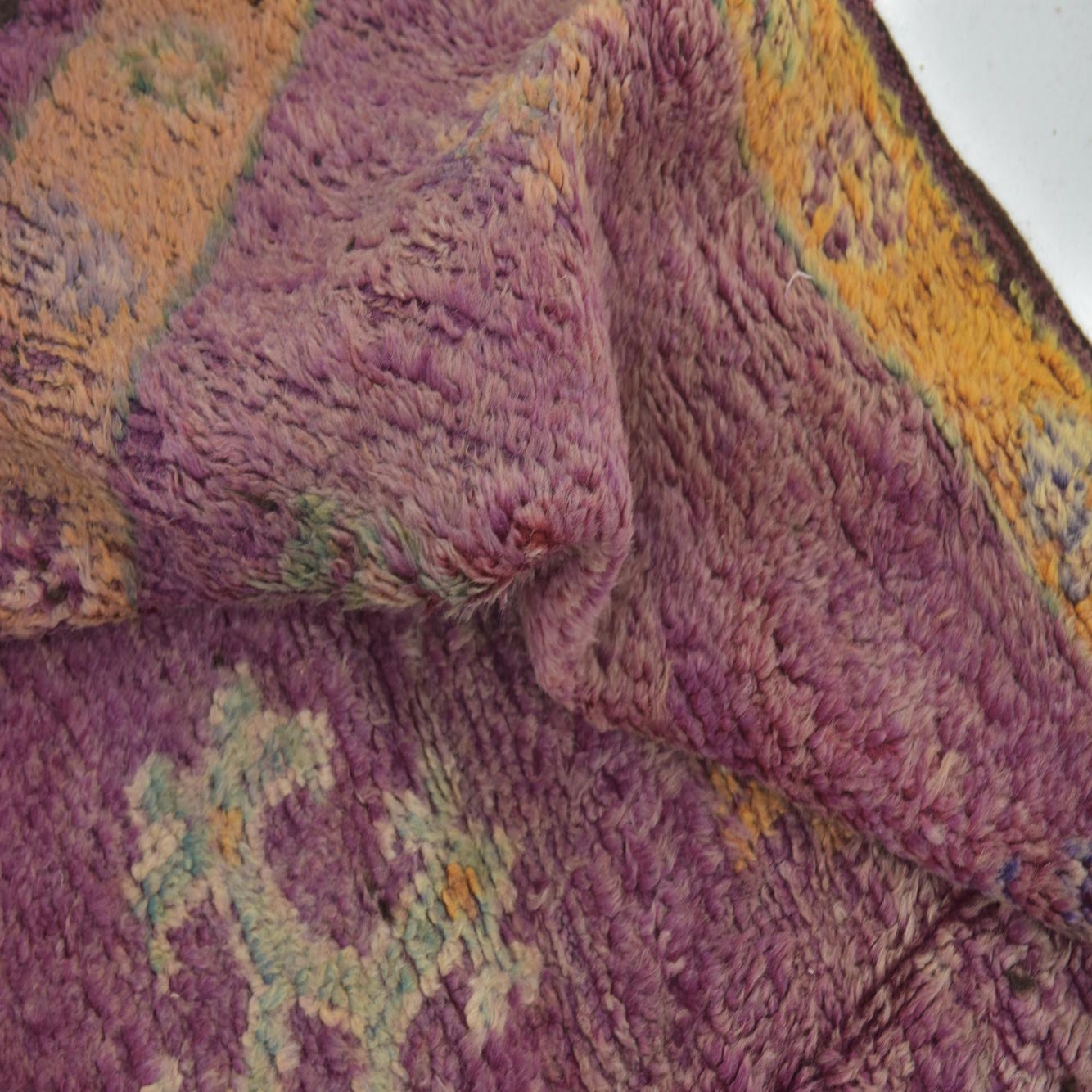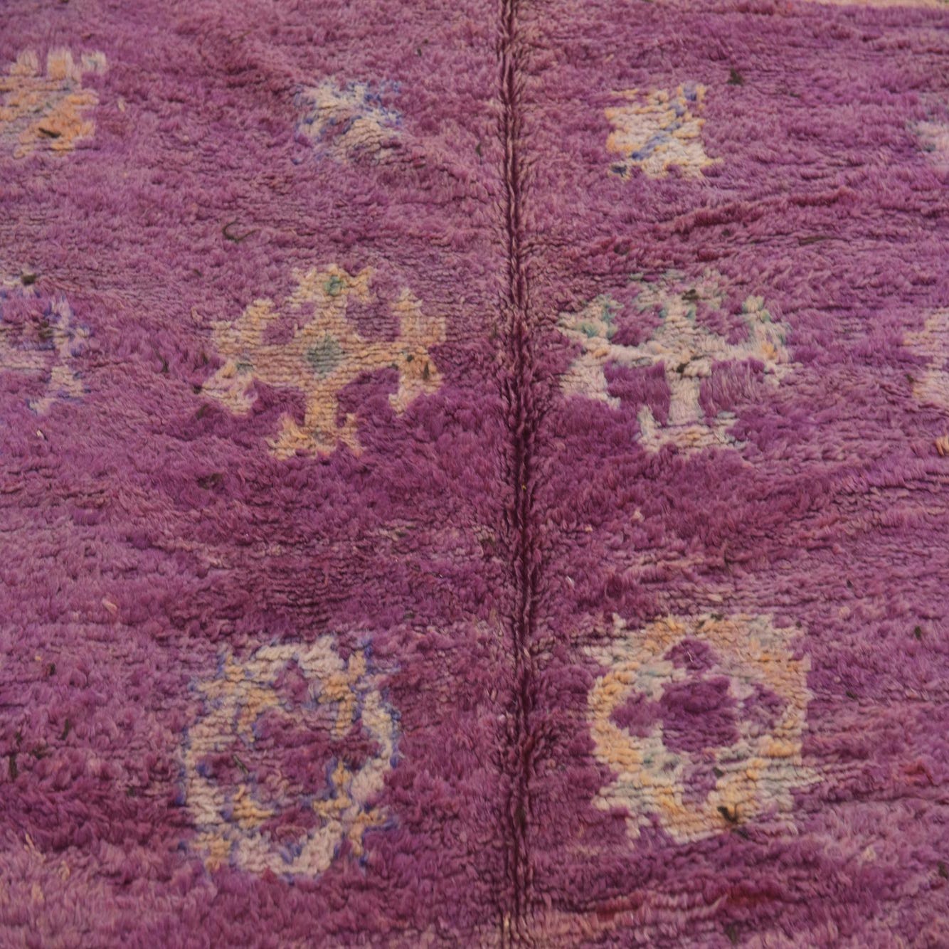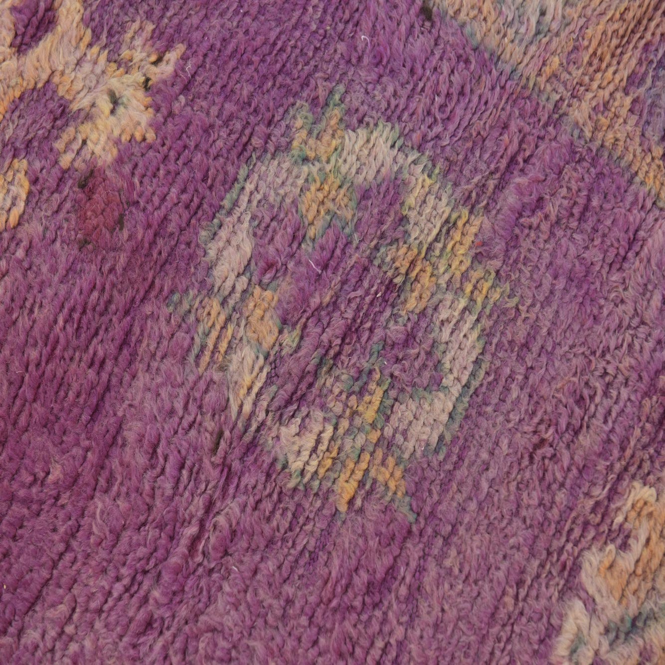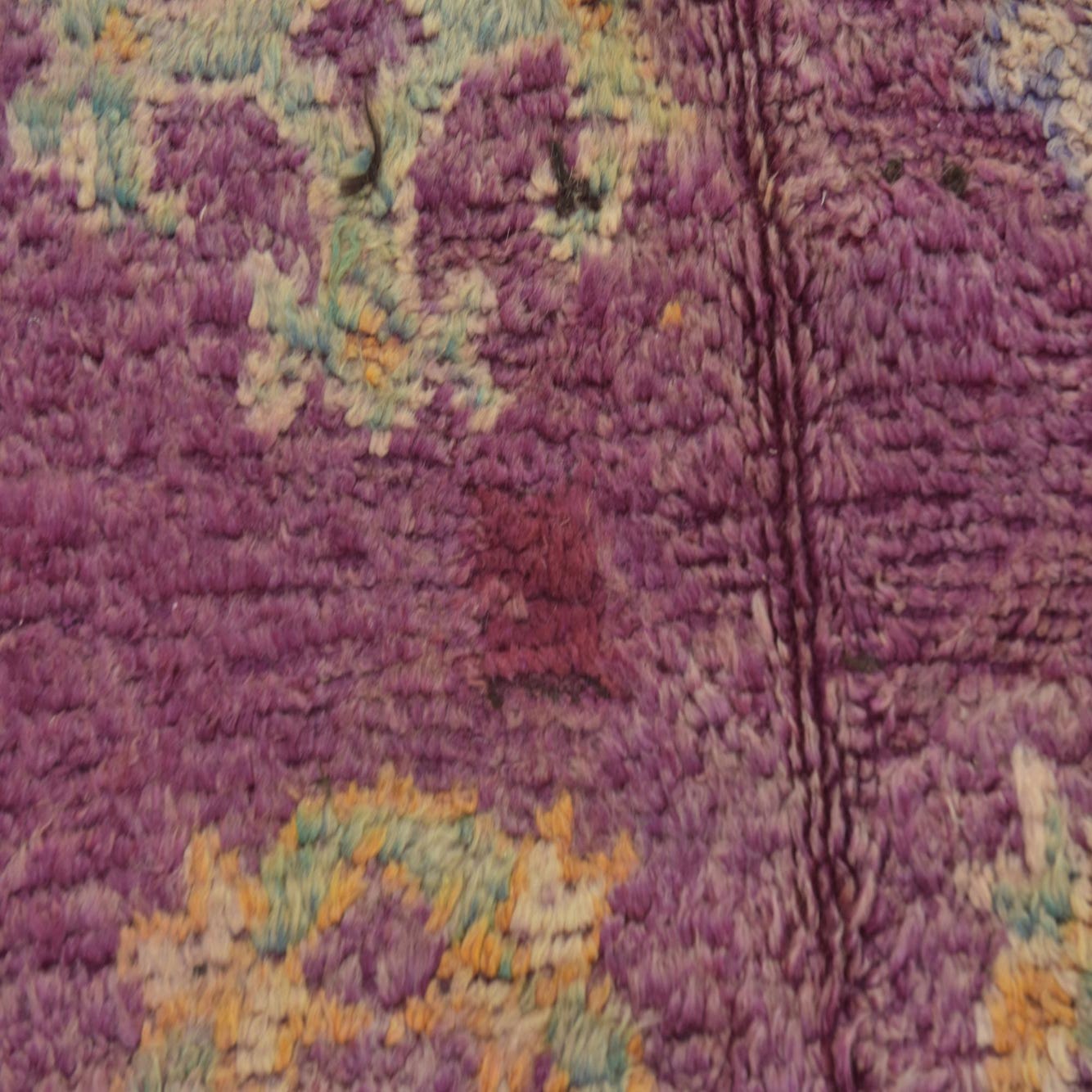 Part of the Moroccan collection, this hand-knotted wool runner is a venerable antique, offering a resonant connection to traditional craftsmanship. The character-rich piece features a violet backdrop, adorned with an array of beige, cream, gray, orange, and peach motifs. These hues manifest in geometric and abstract patterns which, alongside the central diamond design, are hallmarks of Moroccan-inspired aesthetics. The rug reflects a well-loved history, evidenced by repairs and low pile spots that add to its authentic charm. Completed with fringe ends which give it a complete, tactile feel, the runner is well-suited for enhancing long corridors or narrow spaces within eclectic, bohemian, or rustic interiors. As a statement piece, it can also serve as a visual anchor in minimalist settings where its warm colors and unique design can be allowed to stand out.
