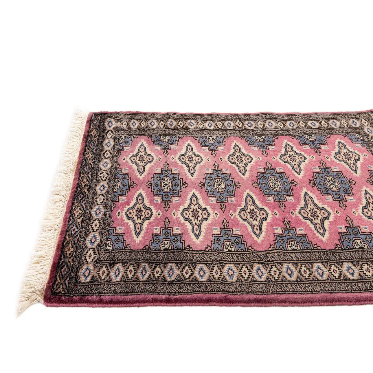 A handmade 2x3 rectangular Bokhara rug featuring a tribal pattern in shades of purple, blue, and cream, with fringe.