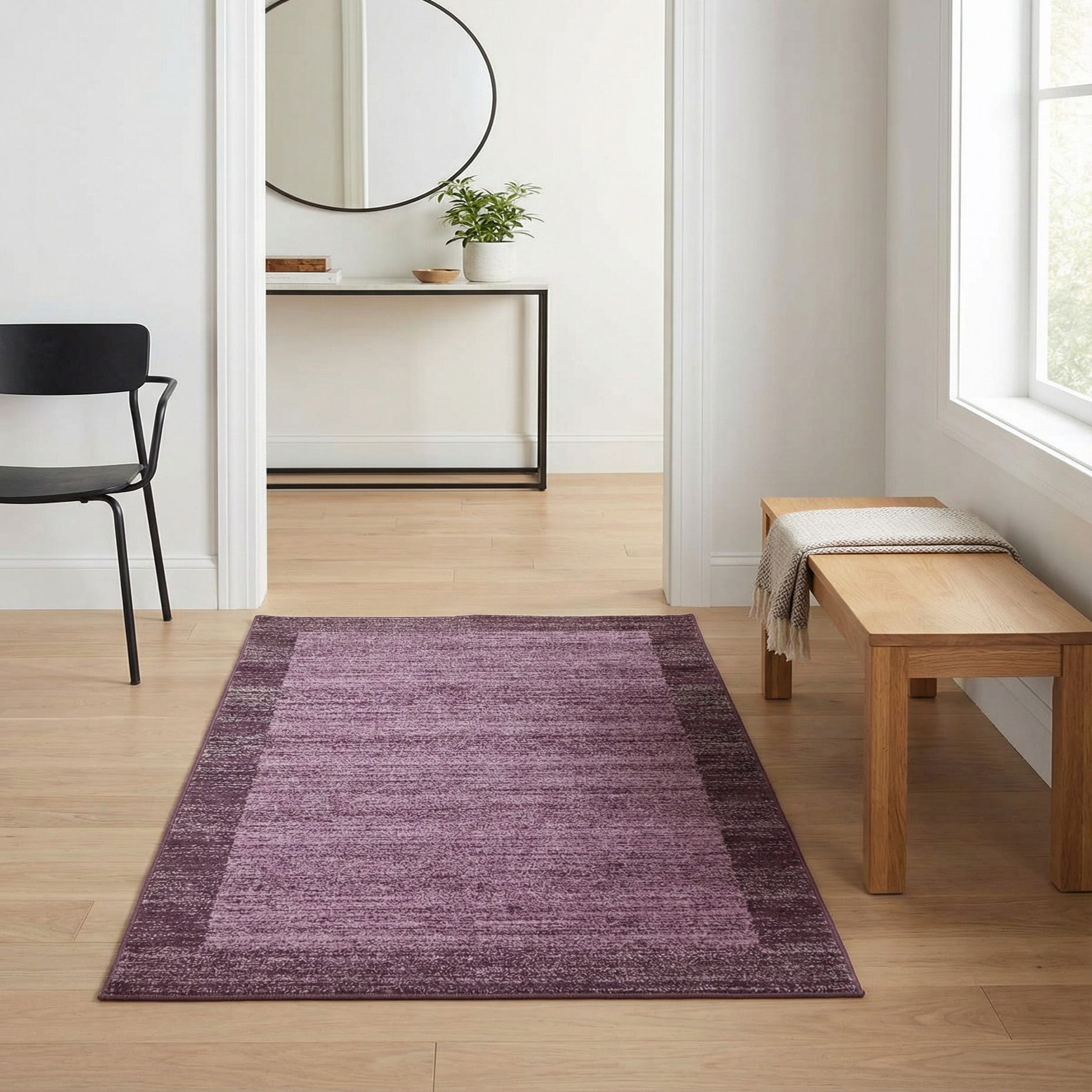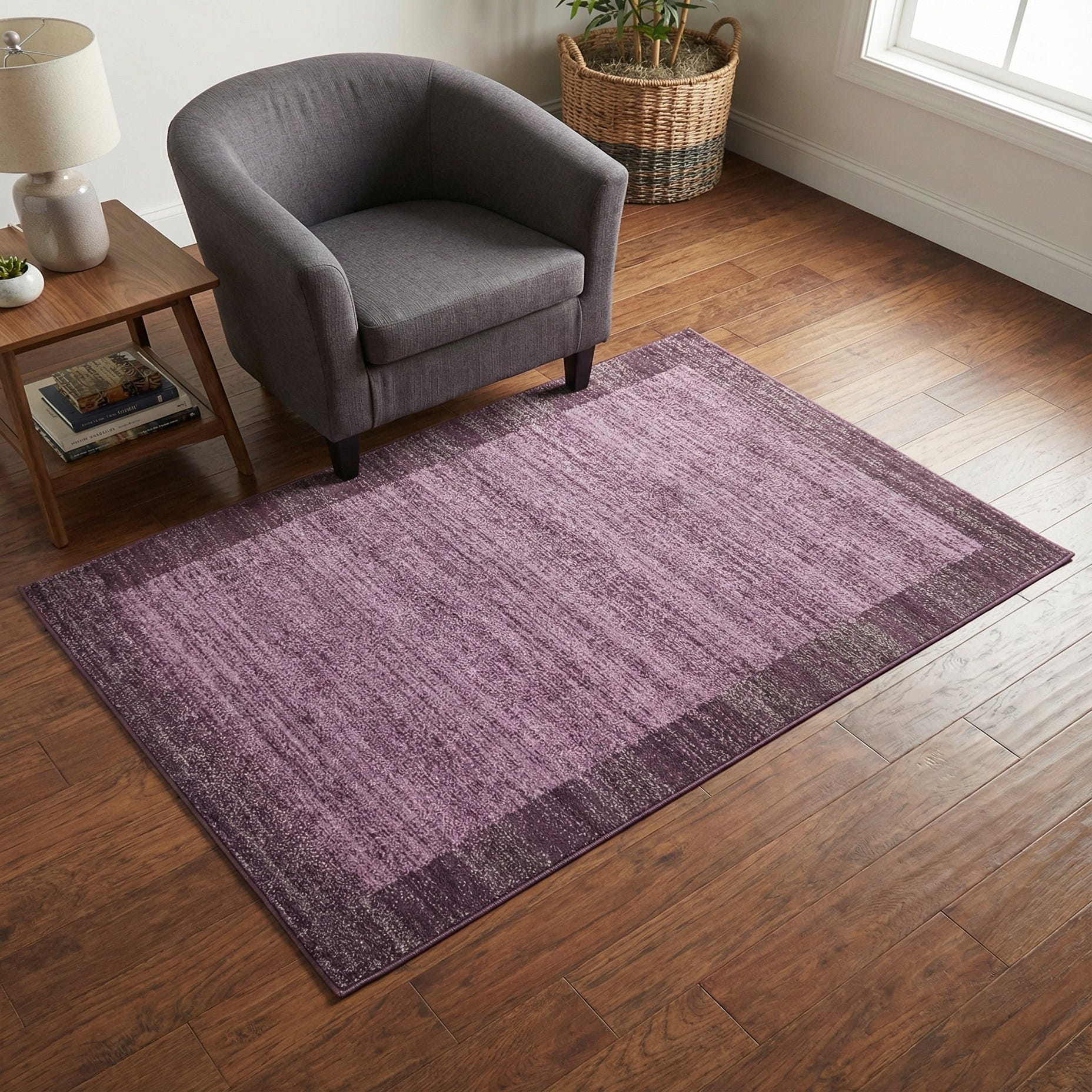 A rich violet field anchors this rug, bordered by a deeper violet band that creates a simple framed effect. The pattern is tone-on-tone with a soft, striated finish—subtle horizontal variations in pile color that add depth without a busy motif. The surface feels low and even underfoot, with a smooth, slightly plush texture created by a machine-made construction in 100% polypropylene.