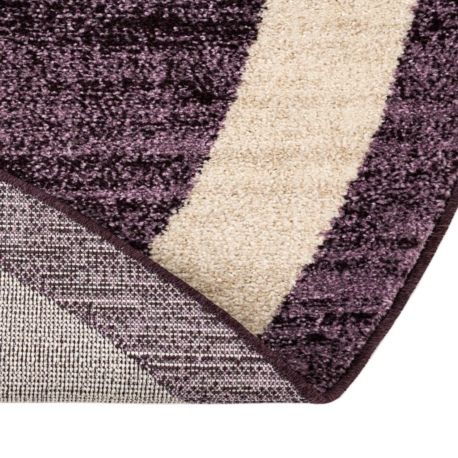 A rich violet field provides a deep, saturated backdrop for a soft, ivory halo that traces the inner edge of the round shape. The surface shows gentle, horizontal striations in varying violet tones that add depth without busying the design, while the mottled ivory band offers a restrained contrast that frames seating areas or a small table. The pile has a low, dense feel that gives a slightly textured hand underfoot while keeping the profile neat and approachable.
