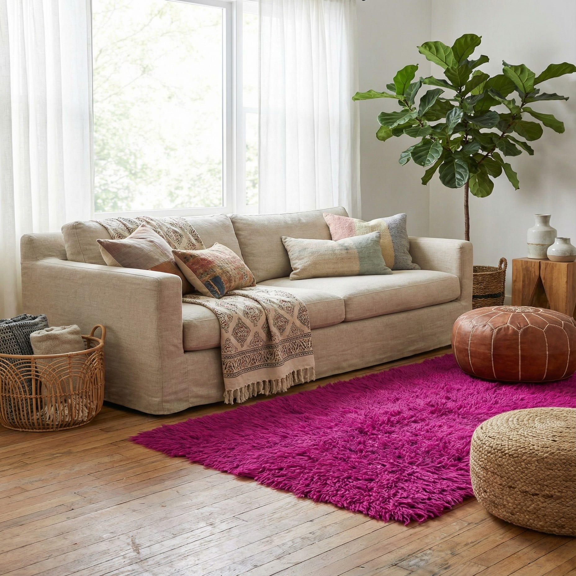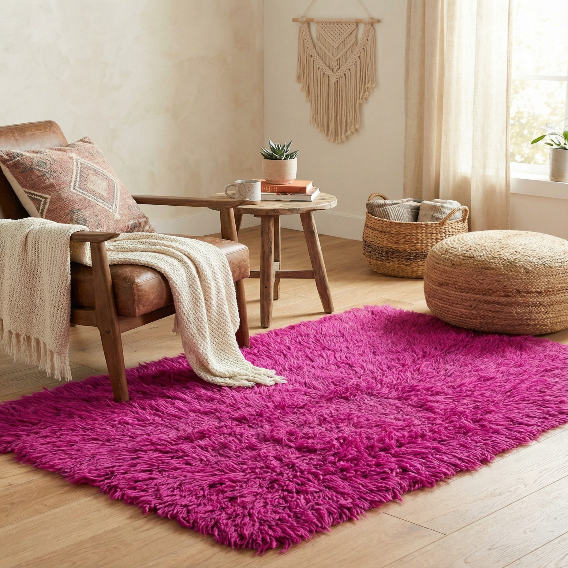 The luxurious wool pile offers an inviting texture underfoot, rendering the piece not only visually striking but also comfortable and plush. The saturated violet color infuses rooms with a bold statement and can complement a variety of decors, from the eclectic bohemian to the more modern and minimalist settings.