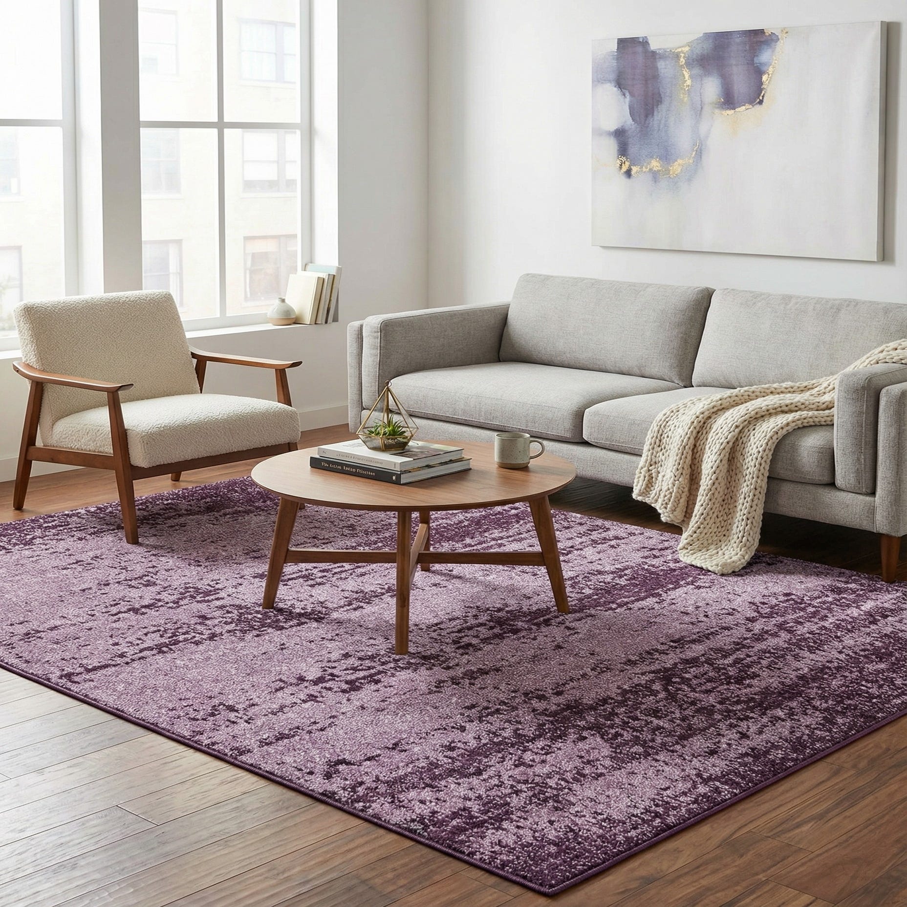 A 4x6 rectangular indoor rug in varying shades of purple with a textured, abstract pattern, suitable for a living room.