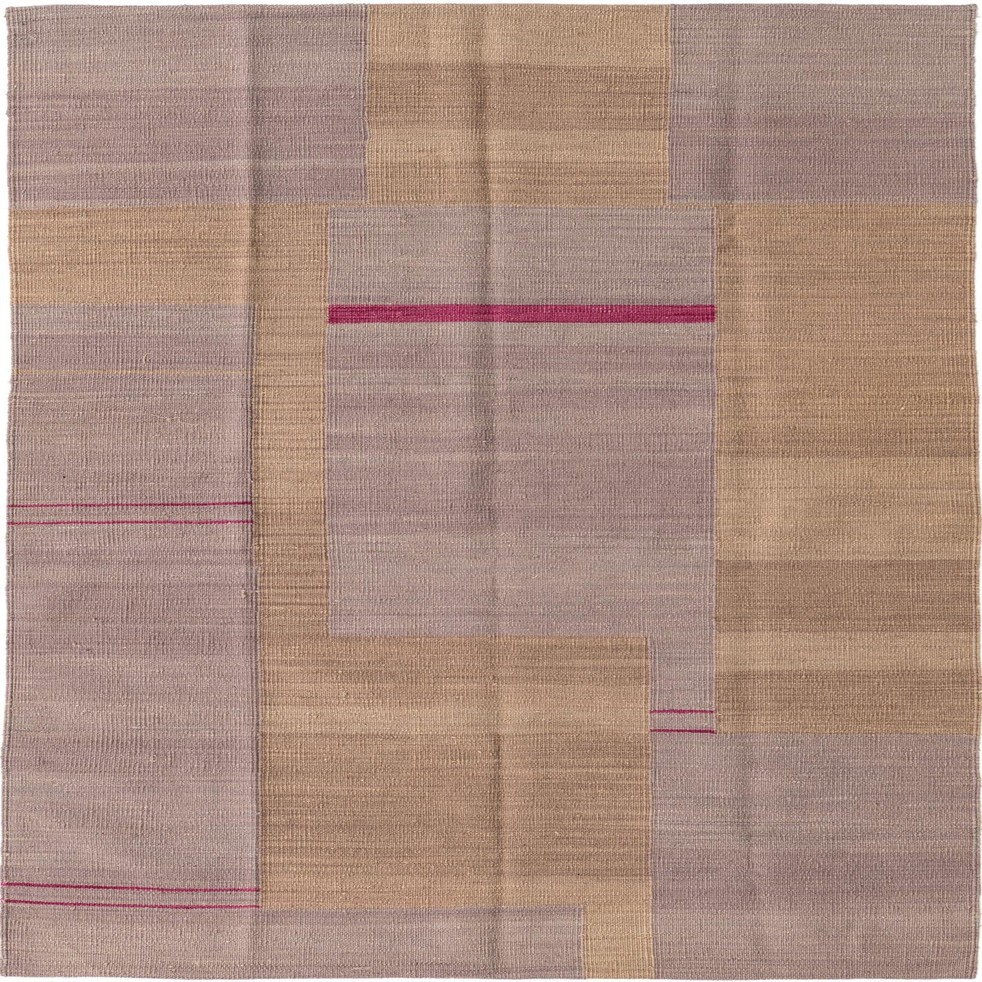 A 4x6 rectangular Kilim Modern wool rug with a flatweave, featuring abstract blocks of purple and beige with thin fuchsia accent lines.