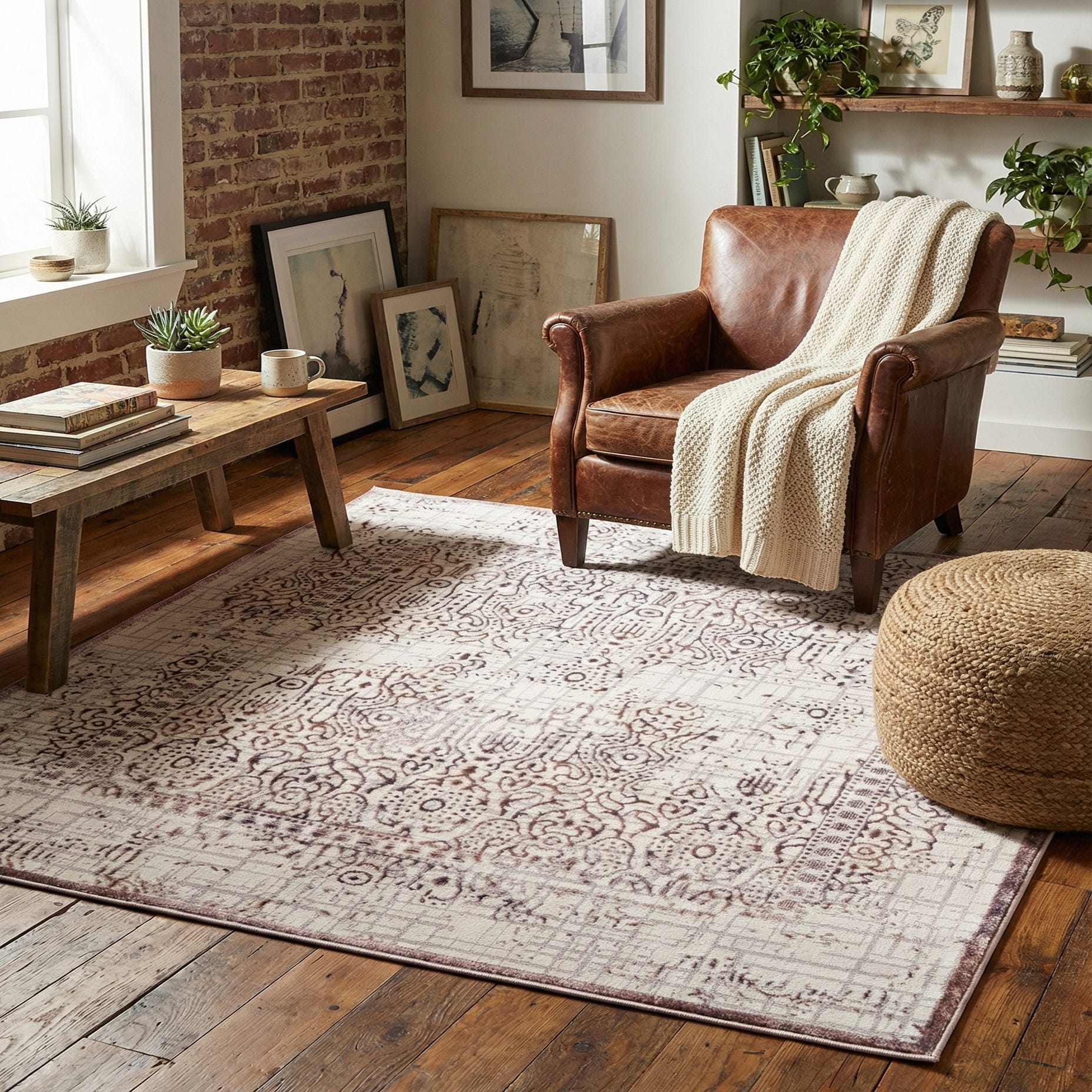 An aged, ornamental pattern combines soft medallion and floral arabesque motifs with a subtle grid-like ground, set on a violet background. Ivory and light brown accents trace the traditional details in a deliberately faded, lived-in finish. Machine-made, 60% polypropylene and 40% polyester construction yields a low-profile pile that feels smooth underfoot with gentle textural variation where the pattern is denser and slightly raised.