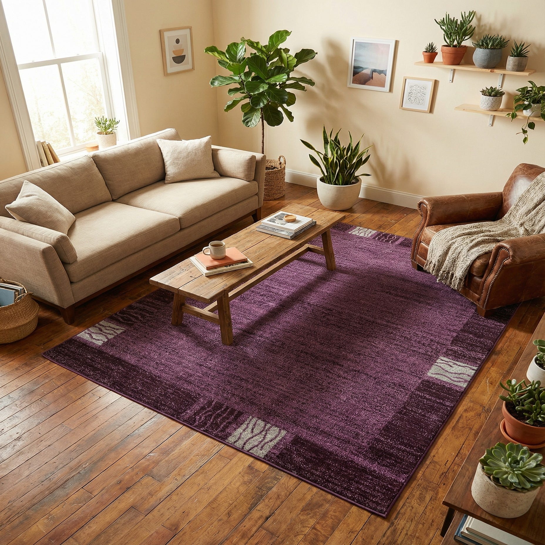 This rug’s violet and gray color scheme allows for versatile placement within various interior design themes. It would complement modern minimalist decors by adding a pop of color or serve as a grounding element in more eclectic settings. It could also be well-suited for contemporary bedrooms or living rooms that employ neutral tones, as the vivid violet could add depth and dimension to the space.