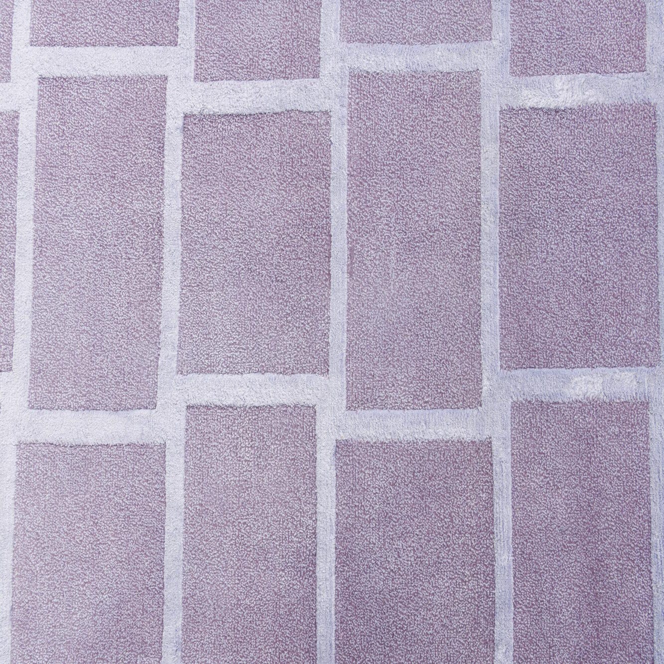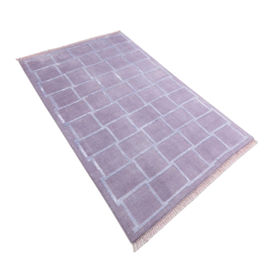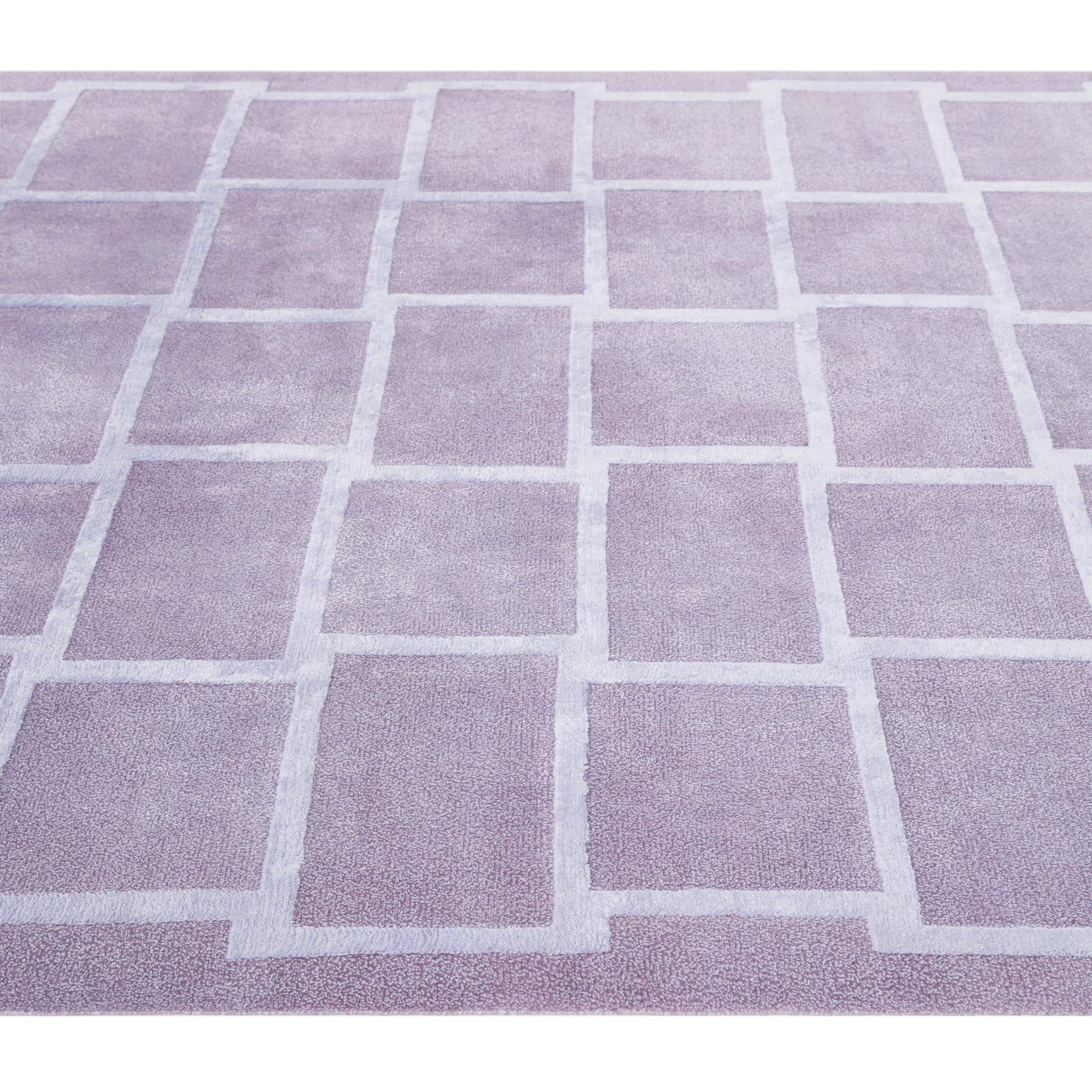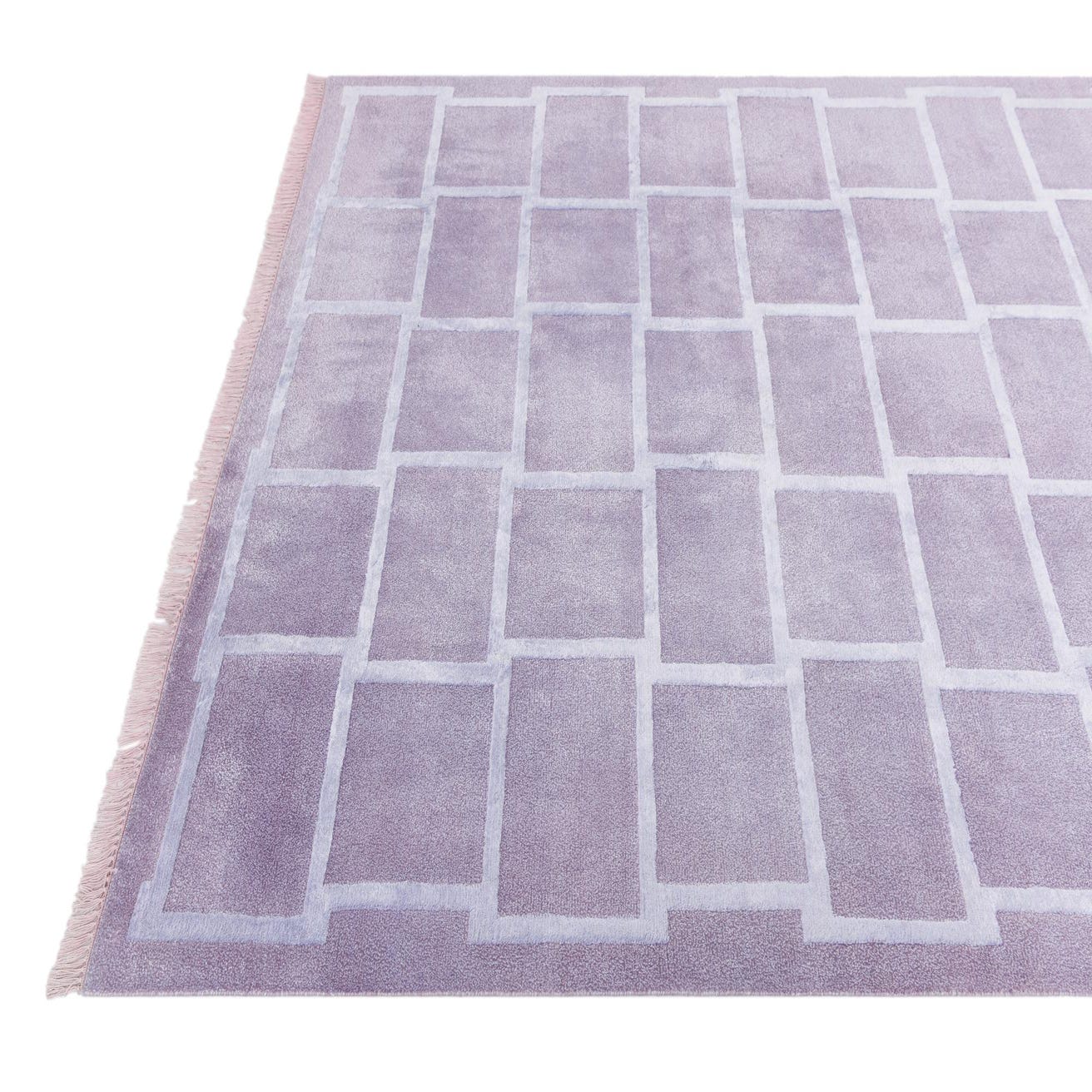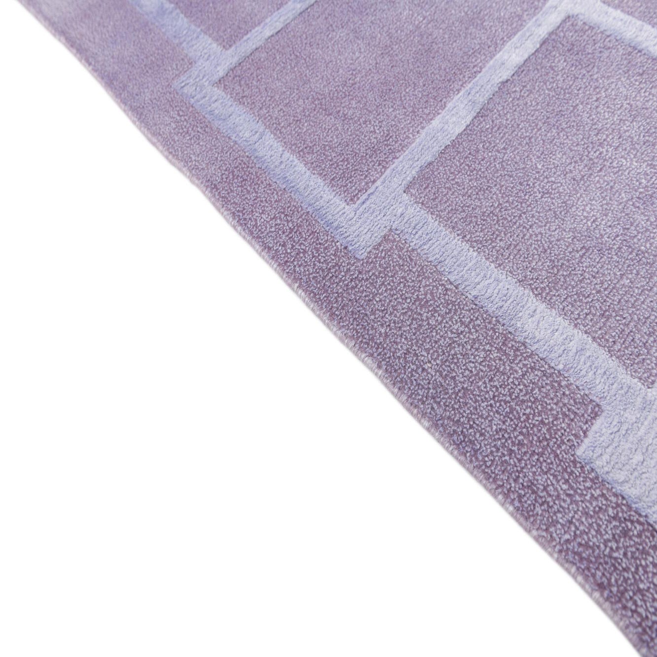 A grid of offset rectangular blocks creates a clean, brickwork pattern on a violet ground, each block carrying subtle shifts in tone that give the surface depth and movement. Narrow, pale borders around the rectangles sharpen the geometric layout and add a light contrast against the violet background. Hand-knotted from 100% wool, the rug has a dense, tactile pile with a soft, slightly cushioned feel underfoot and neatly finished fringe on the short ends.