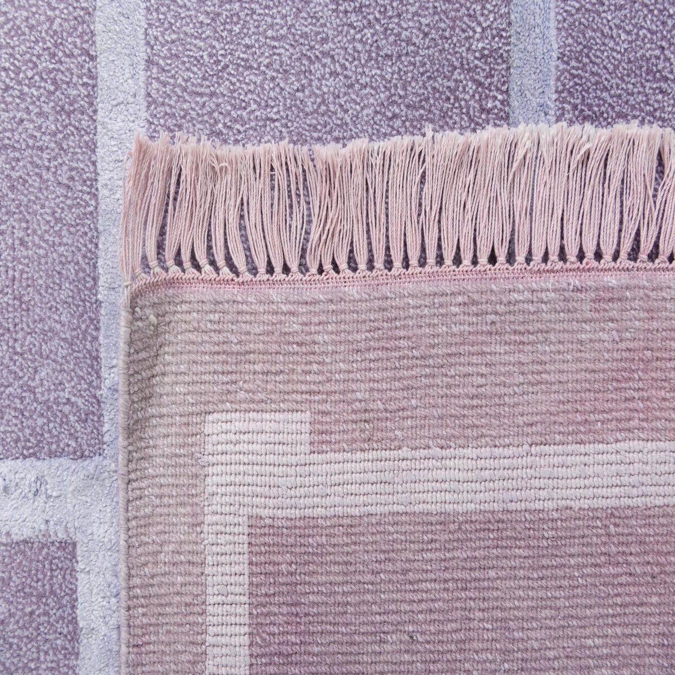 This piece works well as an anchor in a contemporary living room beneath a low coffee table, as a color-forward layer in a bedroom, or to add a calm, modern note to a home office or nursery. Pair it with warm wood tones and brass accents for a balanced look, or layer with soft grays, creams, and dusty rose textiles to emphasize the violet hue. The geometric layout and wool texture make it equally suited to minimalist and transitional interiors.