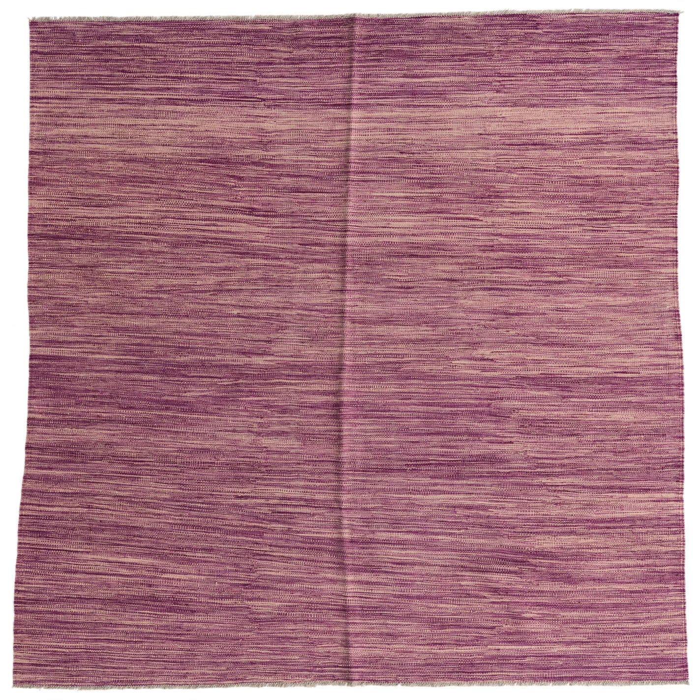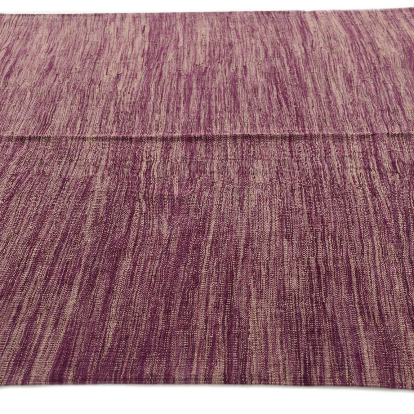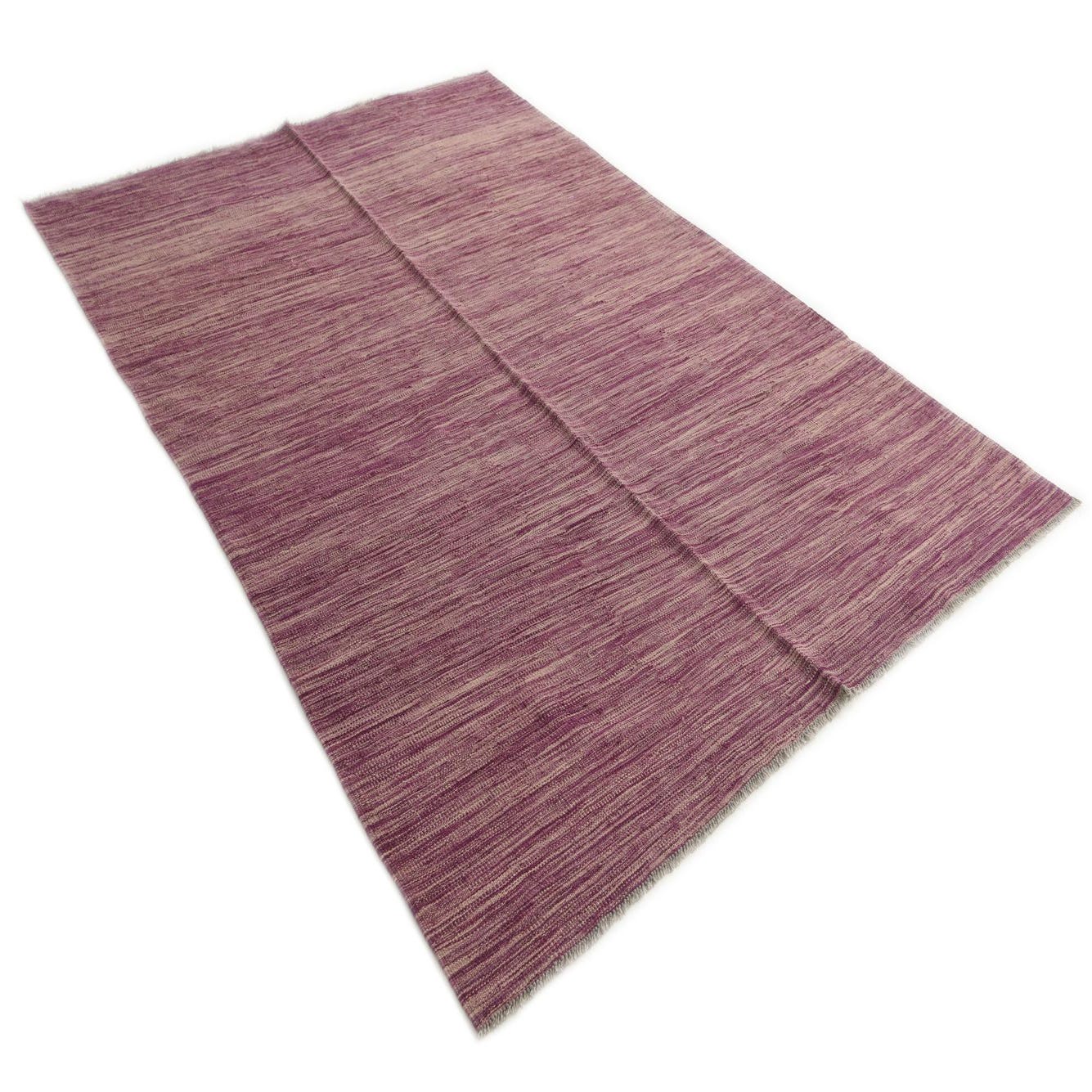 A 5x8 rectangular Kilim Modern flatweave rug in varying shades of purple and beige, showcasing a tribal-inspired abstract pattern.