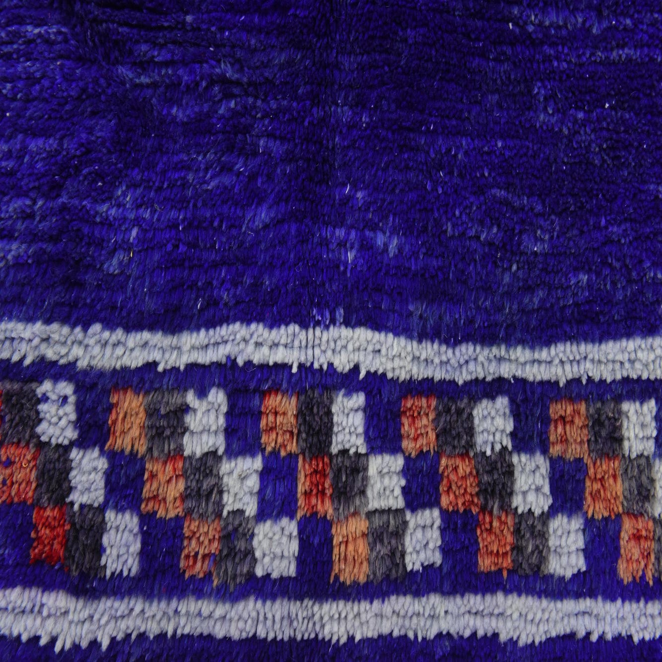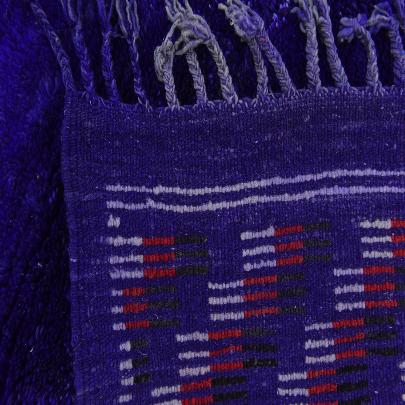 A 5x8 rectangular purple shag rug with a tribal checkered border in white, black, red, and orange.