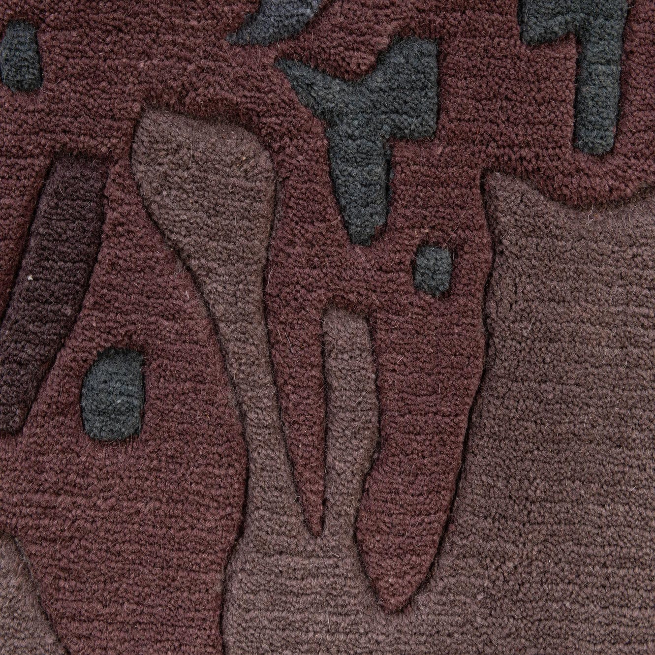 A 5x8 rectangular purple wool rug with a modern abstract pattern in shades of purple, blue, and red, featuring a medium pile and fringe.