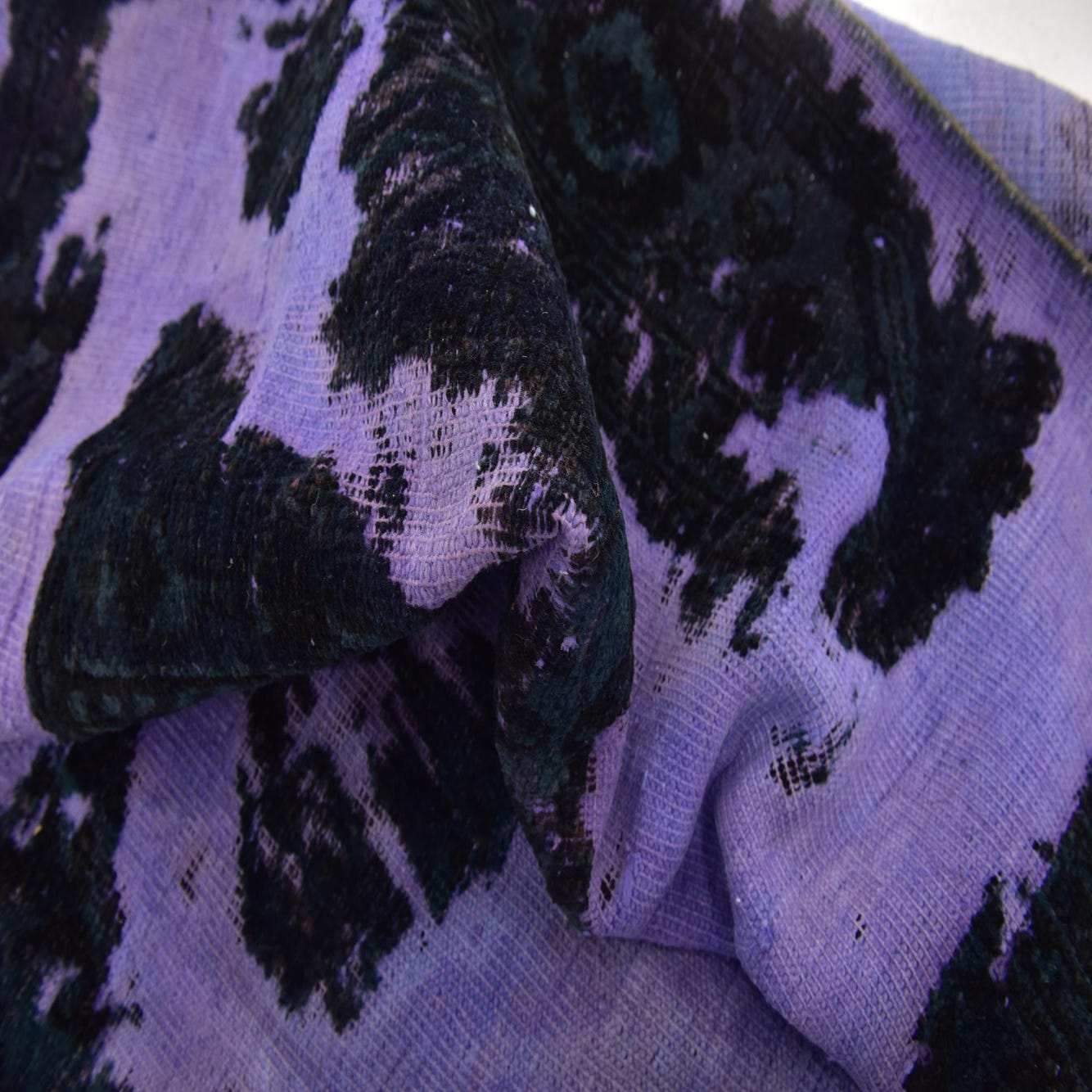 A 5x8 rectangular purple and dark abstract rug with a distressed vintage Persian pattern, suitable for a living room.