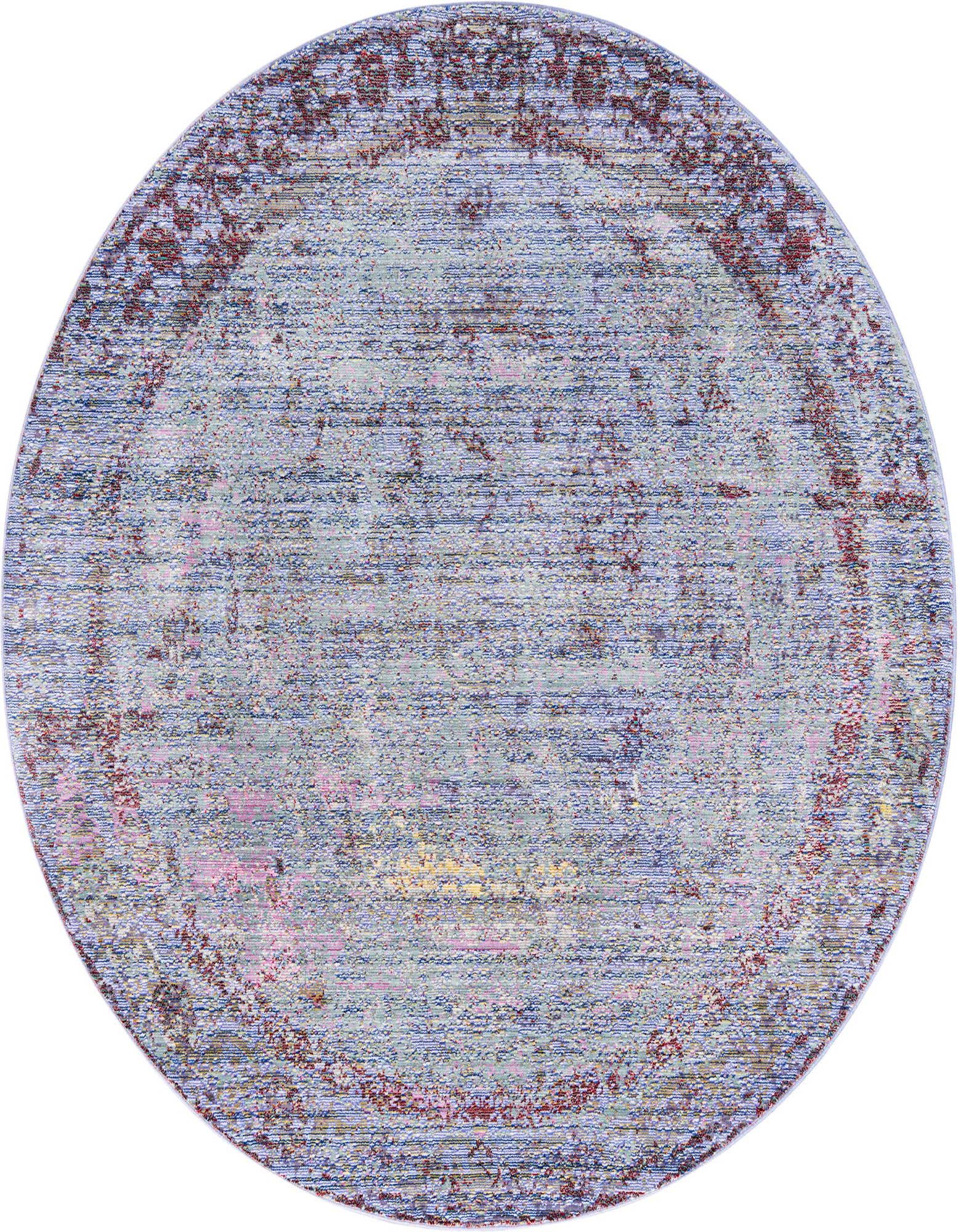 The Alexis Collection offers a 6 Ft Round rug crafted with precision from 100% polyester, machine-woven to ensure durability and ease of maintenance. This piece presents a complex interplay of colors, including violet, brown, burgundy, green, navy blue, purple, and yellow, set against a violet background that provides a rich canvas for the design.