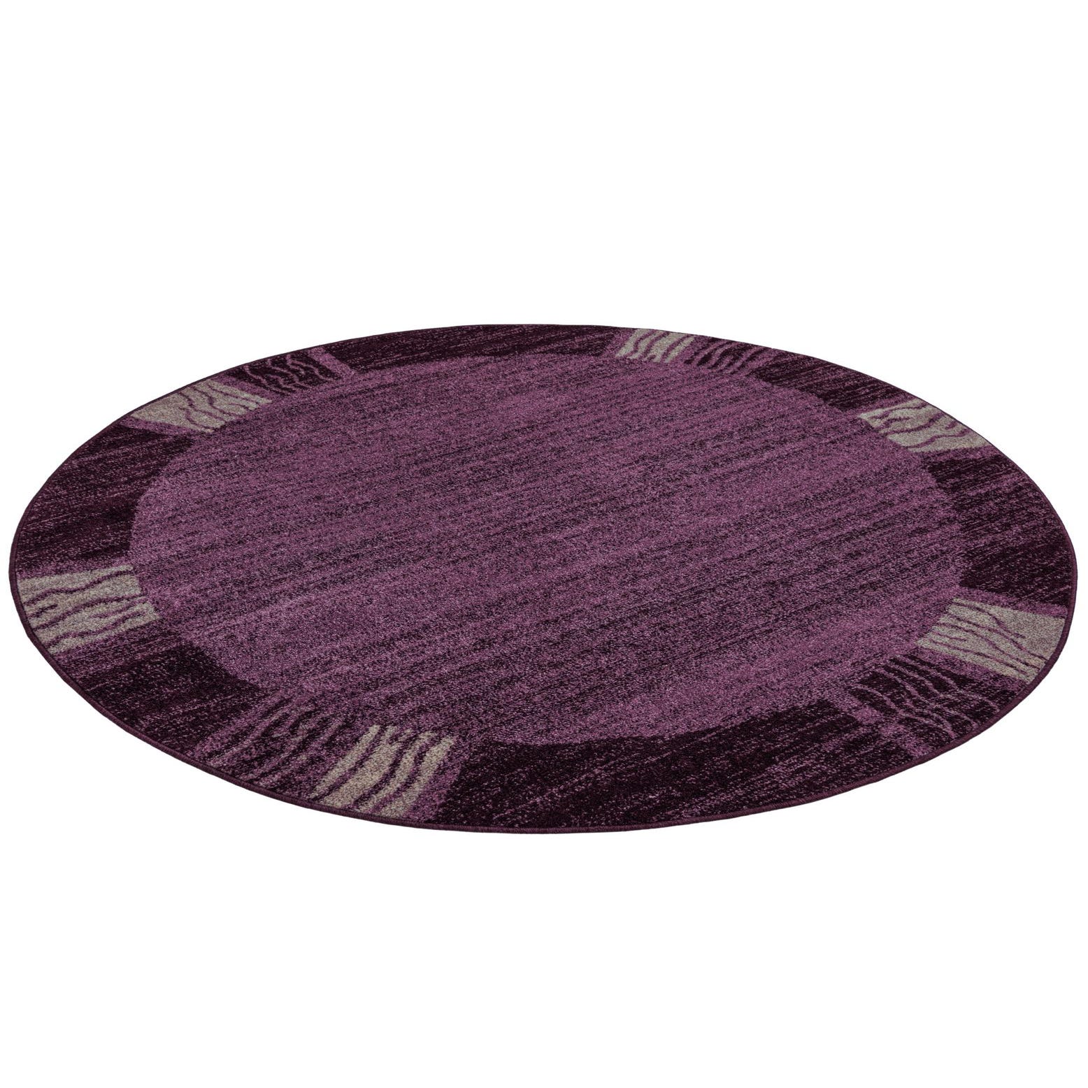 A 6' round purple area rug with a dark purple border and light grey abstract wave patterns.