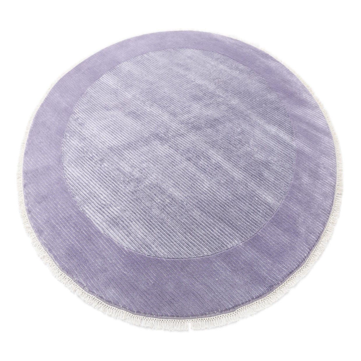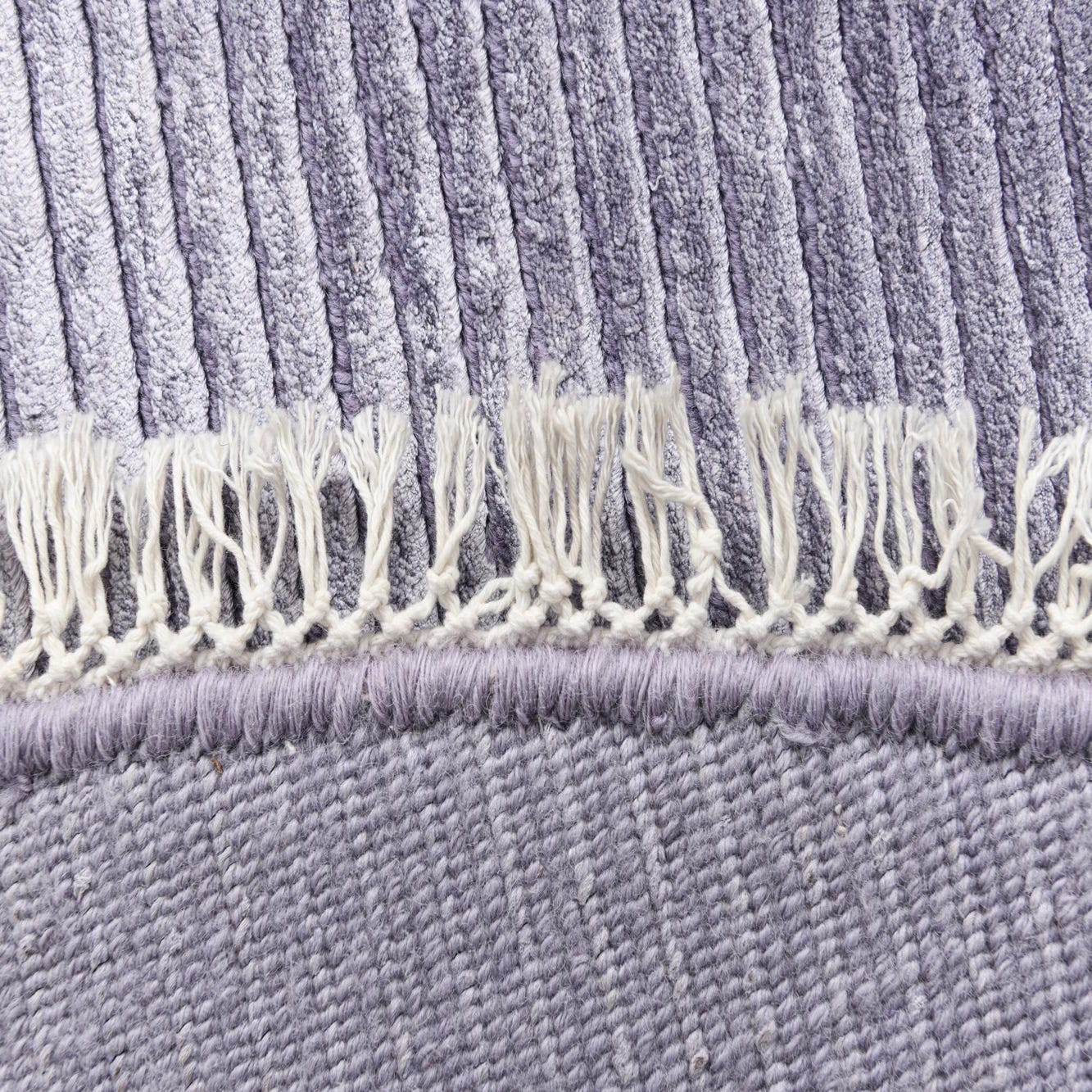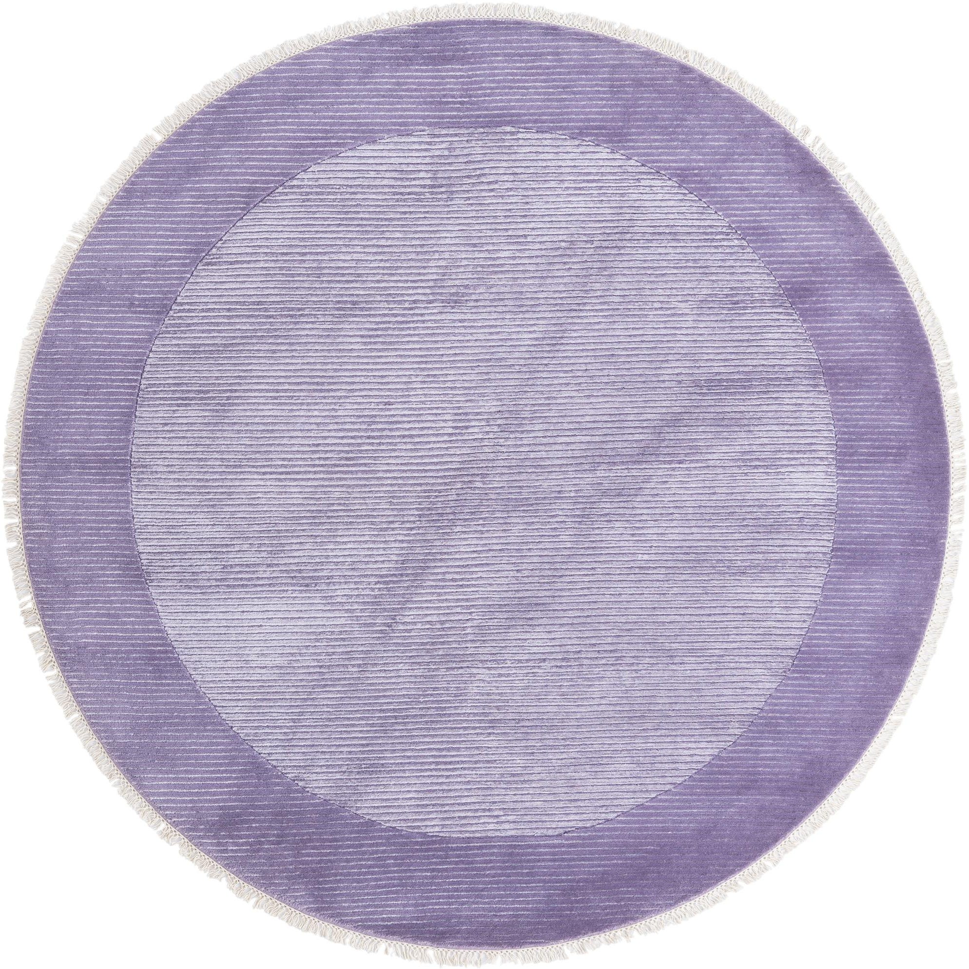 A round 6' 6 x 6' 6 purple wool rug with a subtle striped pattern and fringe, perfect for a modern living space.