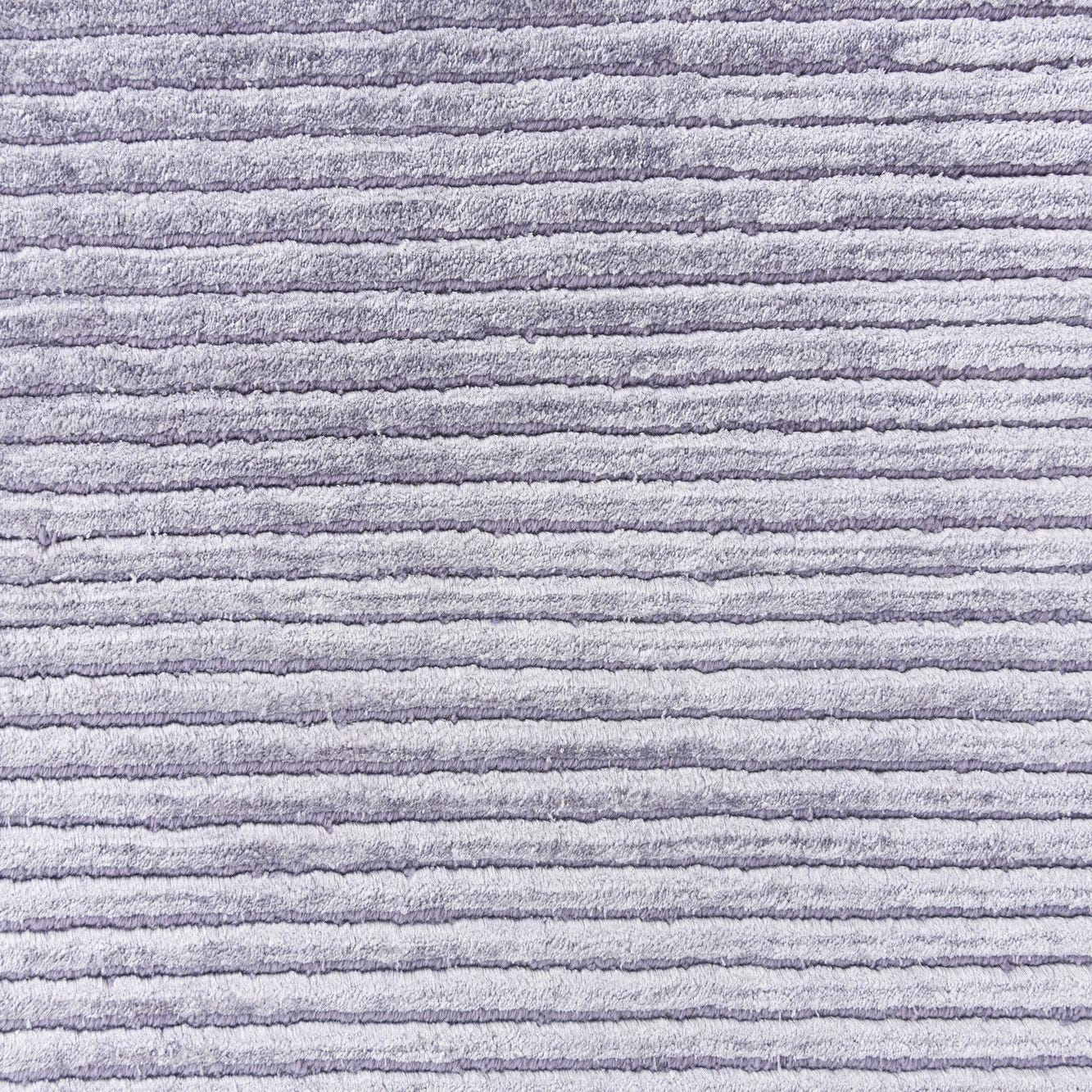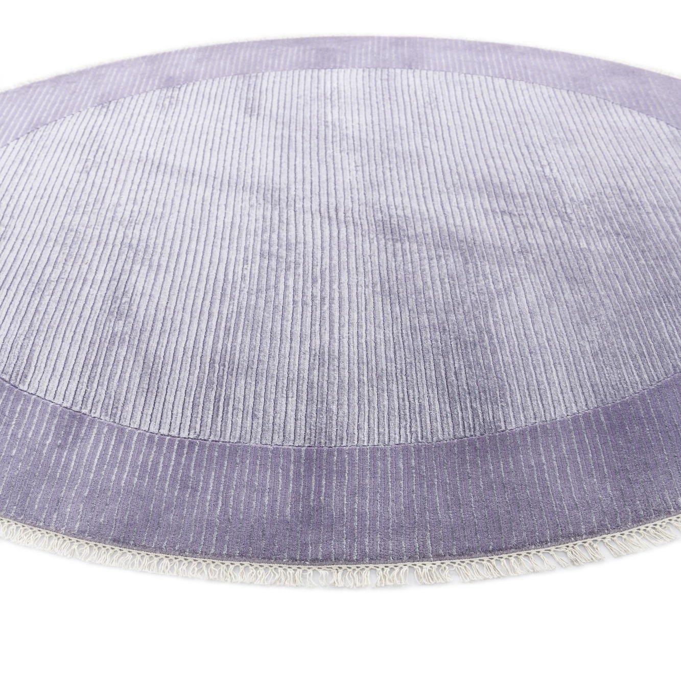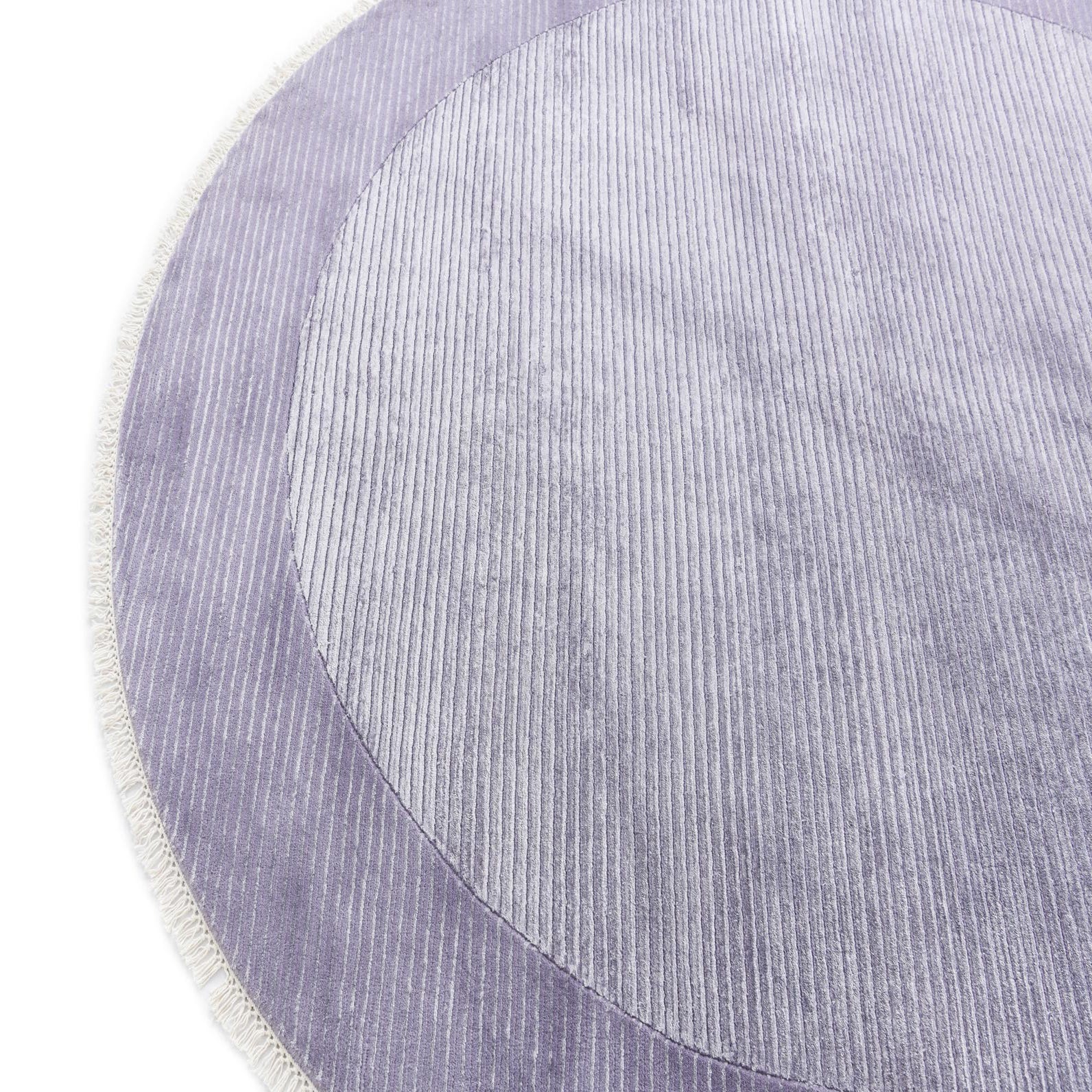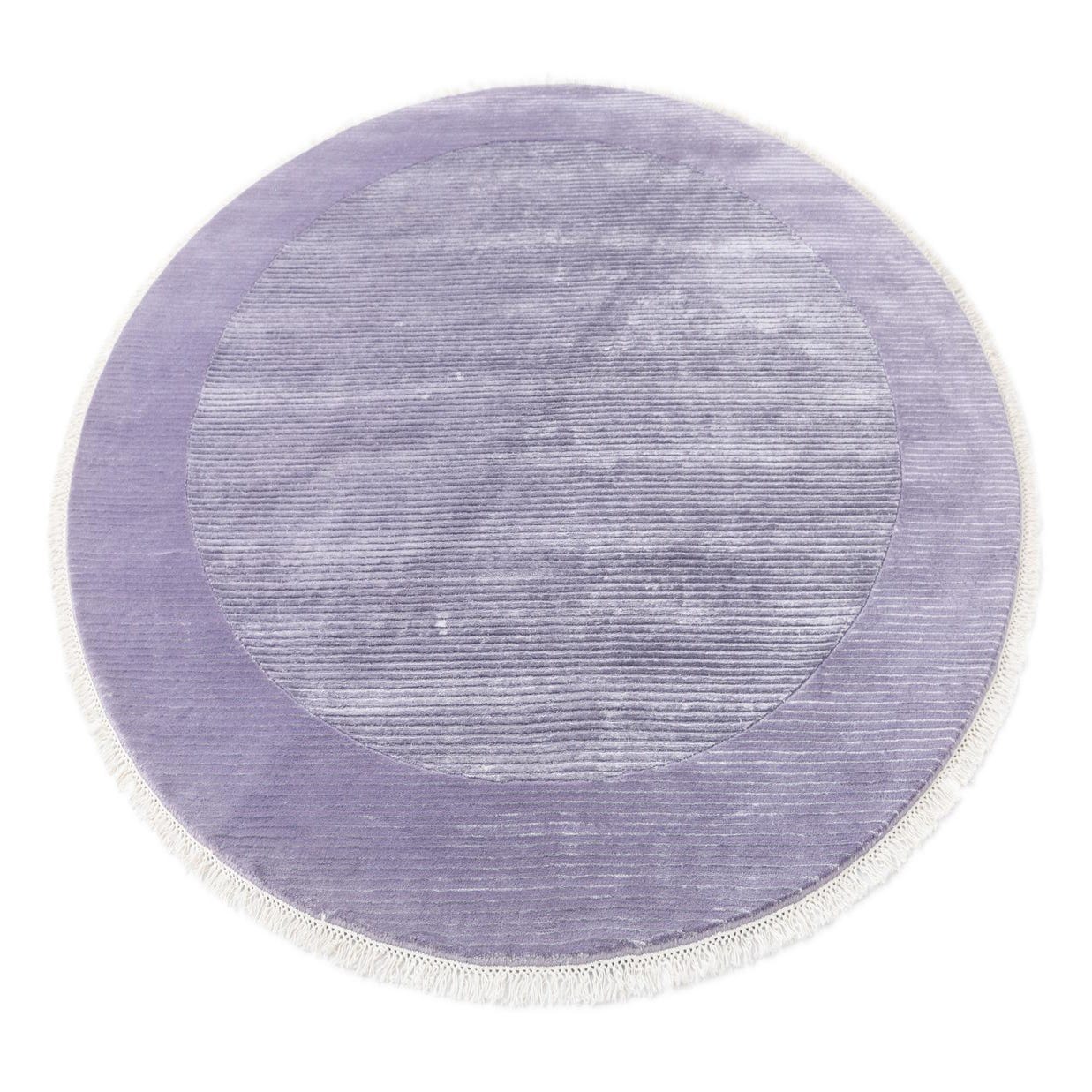 A round 6' 6 x 6' 6 purple wool rug with a subtle striped pattern and fringe, perfect for a modern living space.
