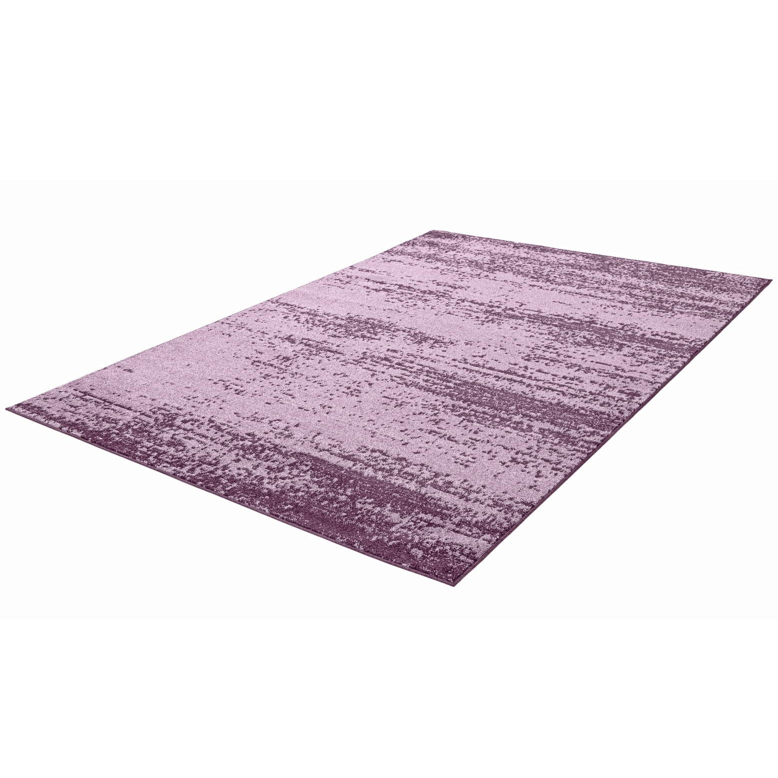 An abstract, distressed striation pattern moves across a violet ground, with bands of deeper plum and softer lilac woven in for subtle tonal variation. The machine-made construction creates a low-profile pile with a gentle sheen and a smooth, slightly plush hand that invites touch while keeping the surface refined. The overall look leans contemporary with a soft, lived-in character that complements both modern and transitional interiors.
