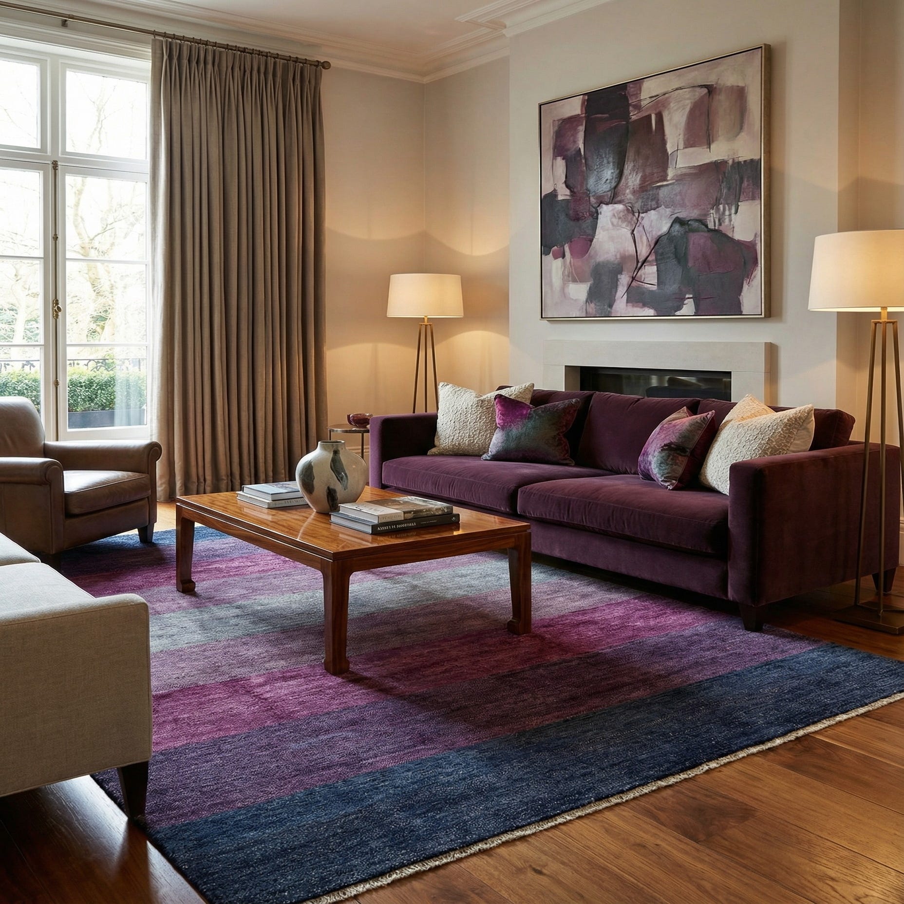Given its size and striking color palette, this piece is a versatile addition to any living space. It could serve as a focal point in a minimalist contemporary setting or blend seamlessly into a more eclectic interior where it can complement existing color accents. Additionally, the rug's simplicity makes it suitable for office environments where a touch of refined color is desired to enhance the overall aesthetic.