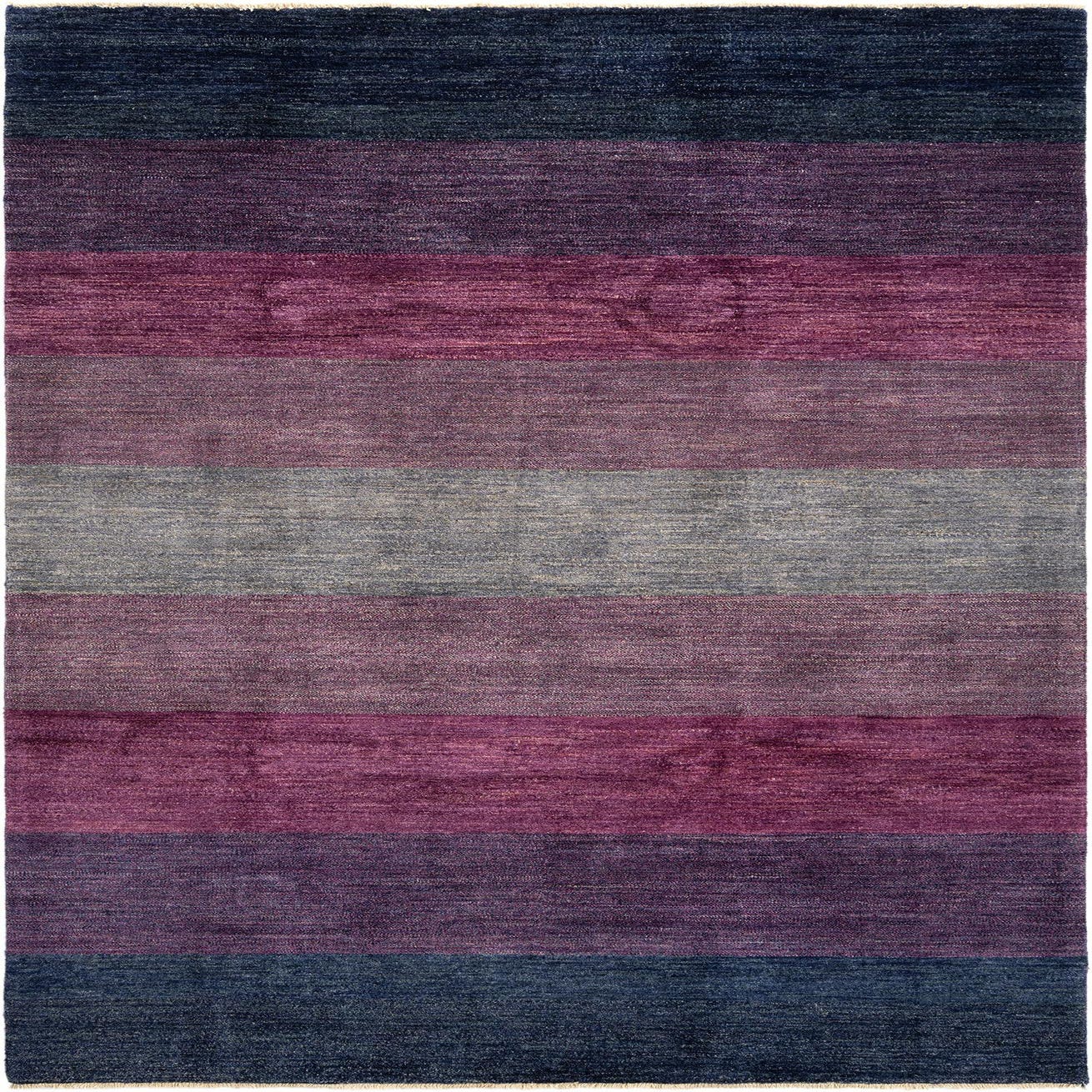 The Tabiibaft Collection 6x9 area rug is a handcrafted piece made of 100% wool, showcasing a modern interpretation of classic design through its bold and dynamic color scheme. The rug features horizontal bands of color in various shades of violet, dark blue, pink, and grey, set against a deep violet background, creating a vibrant yet harmonious visual effect. Its texture is indicative of high-quality wool, offering both durability and comfort underfoot.