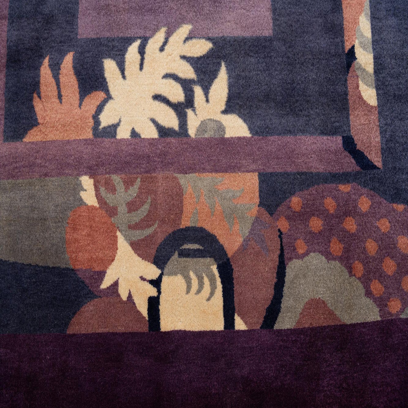 A 6x9 rectangular purple wool rug with a modern abstract oriental pattern, featuring layered geometric shapes and organic motifs in varying shades of purple, blue, and earth tones.