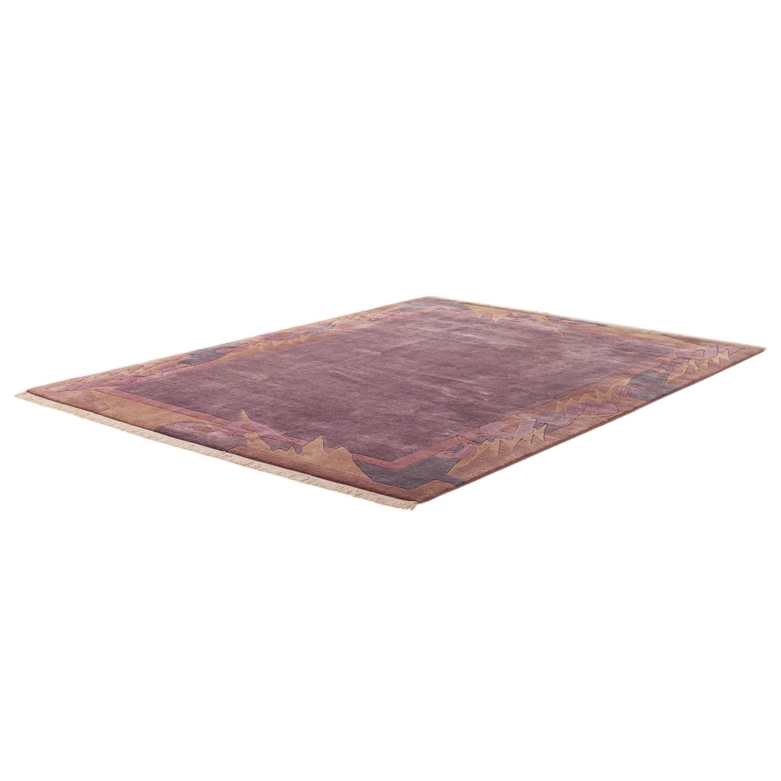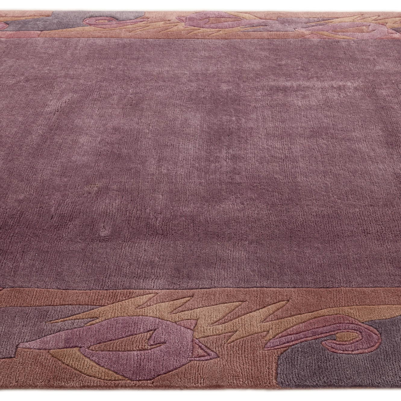A 6x9 rectangular wool rug with a deep purple center and a border featuring abstract floral and geometric shapes in lighter purples, grays, and browns.