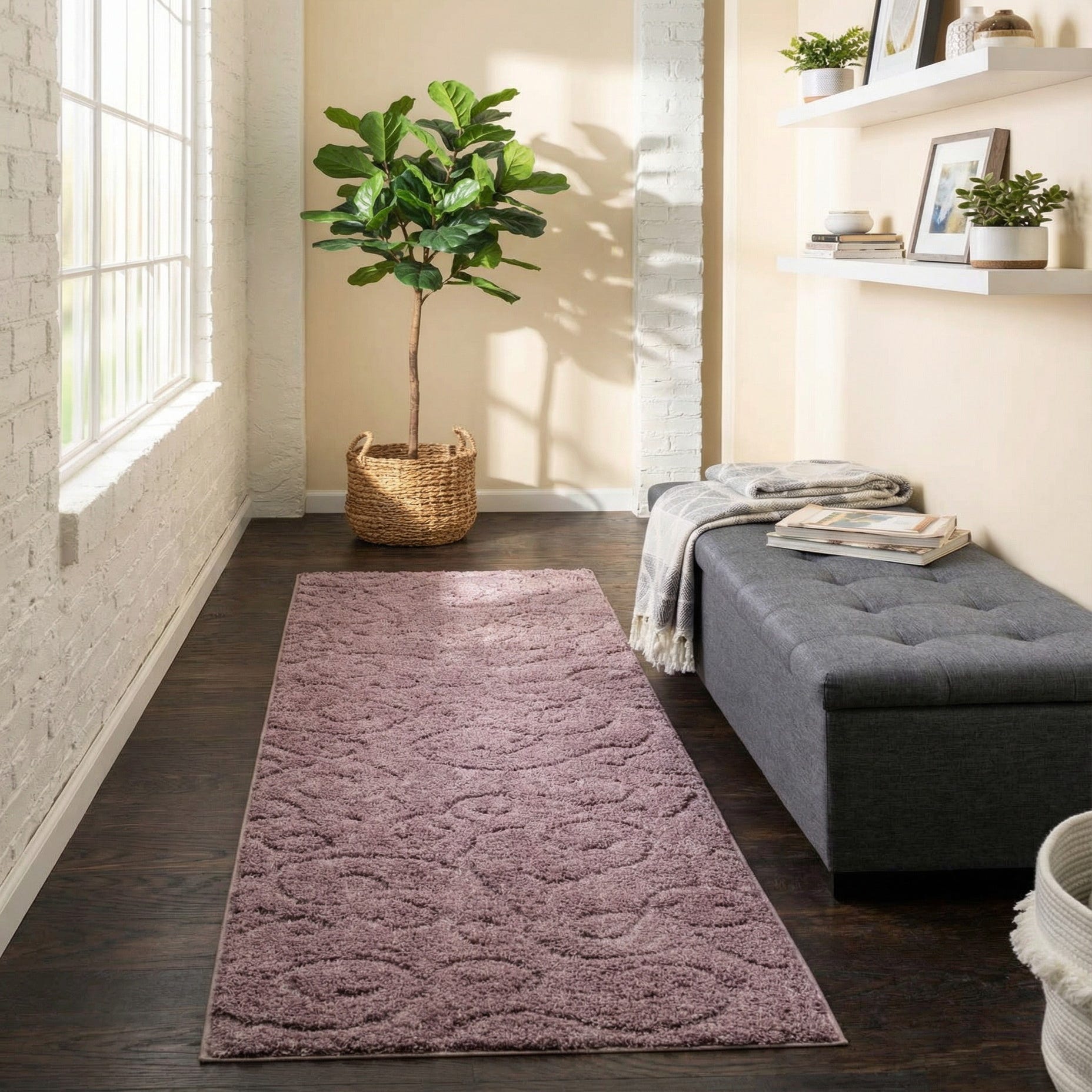 The surface is plush and inviting to the touch; long polyester fibers create a cushioned, velvety feel underfoot typical of a shag construction. Machine-made from 100% polyester, this runner pairs well with warm wood floors, painted trim, or layered over a larger neutral area rug to introduce color and texture. Place it in a hallway to anchor circulation, alongside a bed for a cozy bedside landing, or in a dressing area or entry to soften the space. It complements modern-bohemian, contemporary, and transitional interiors—pair with brass or matte black accents and textiles in cream, plum, or muted jewel tones for a cohesive scheme.