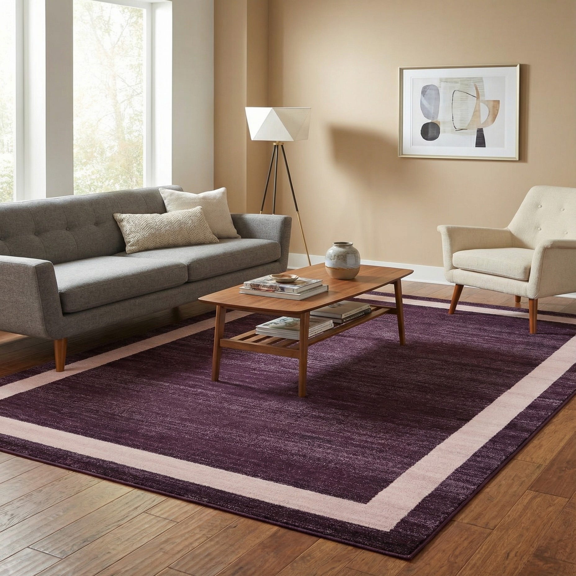 A 7x10 rectangular purple area rug with a light beige border, featuring a subtle textured pattern, suitable for a living room.