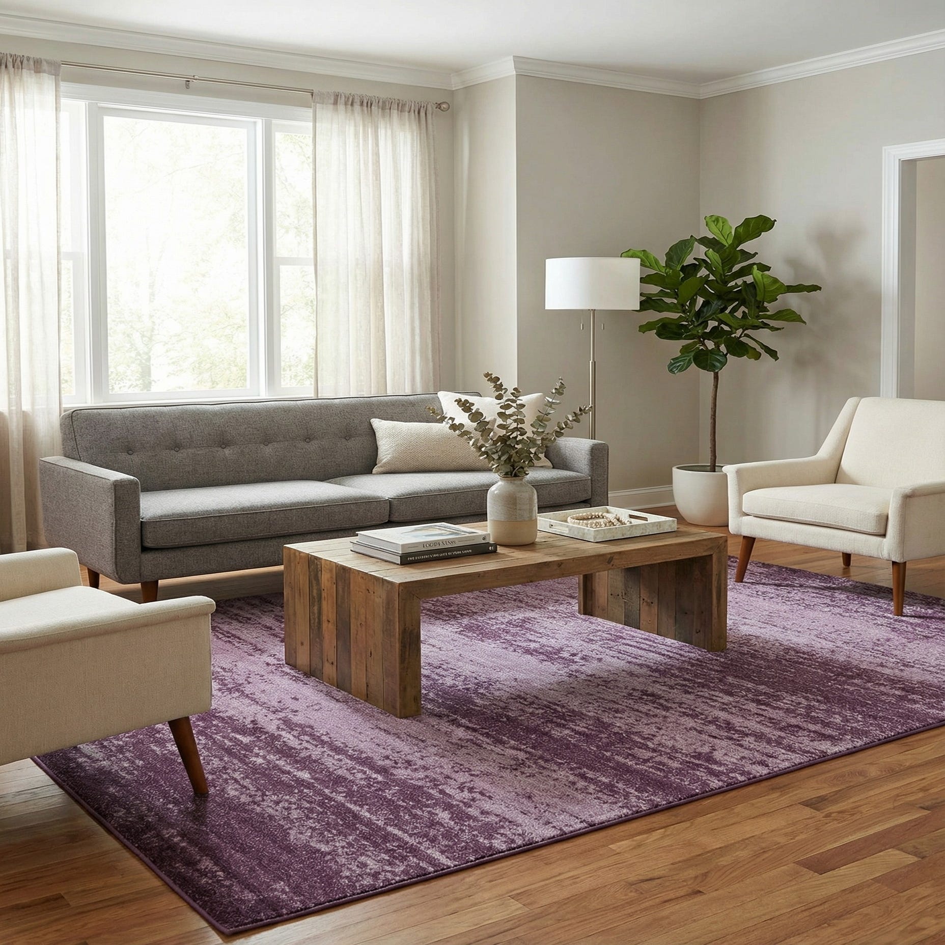 The rug's gradient pattern, transitioning from darker edges to lighter hues towards the center, provides versatility in styling. This piece can complement various interior designs, from modern minimalist to contemporary eclectic settings, adding a touch of tranquil color to the space. Its rich violet tones cam blend harmoniously with neutral furnishings, or offer a bold contrast to lighter, airy decors. This area rug is an ideal choice for living areas, bedrooms, or studies seeking a serene yet sophisticated floor covering.