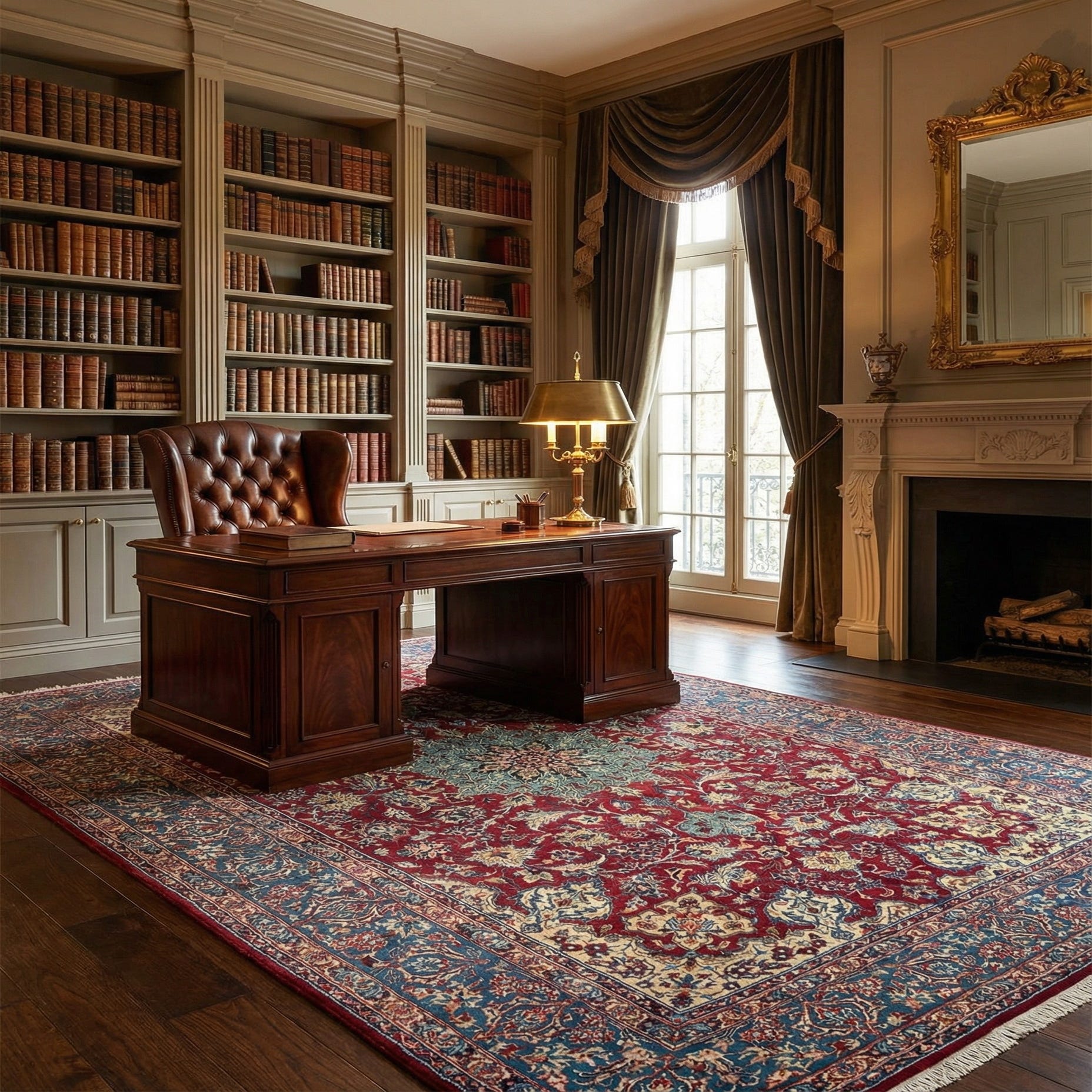 A 7x10 rectangular Kashan Persian rug with a rich purple field, intricate floral patterns, and a teal border.