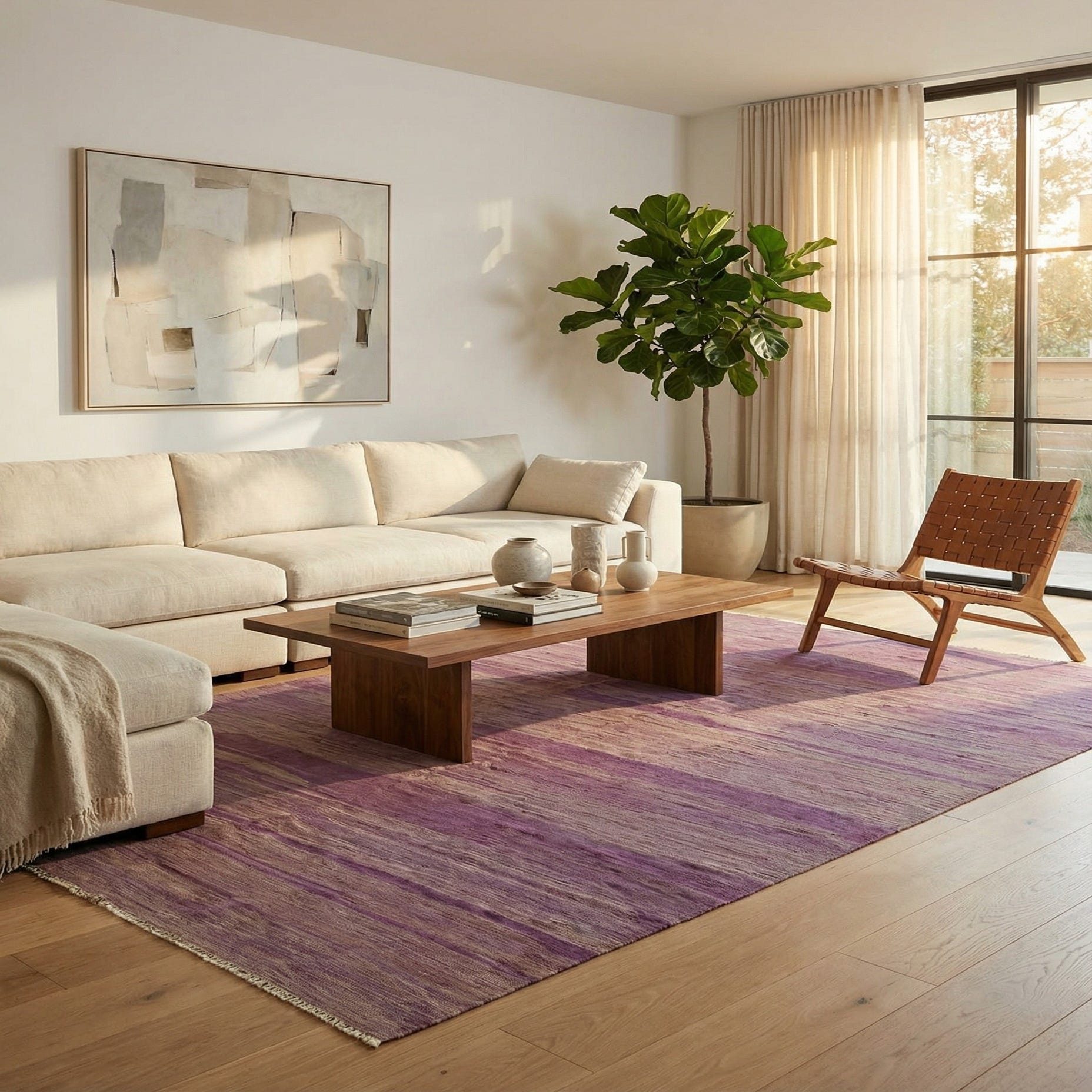 A 7x10 rectangular purple flatweave wool rug with subtle horizontal variations, suitable for a living room.