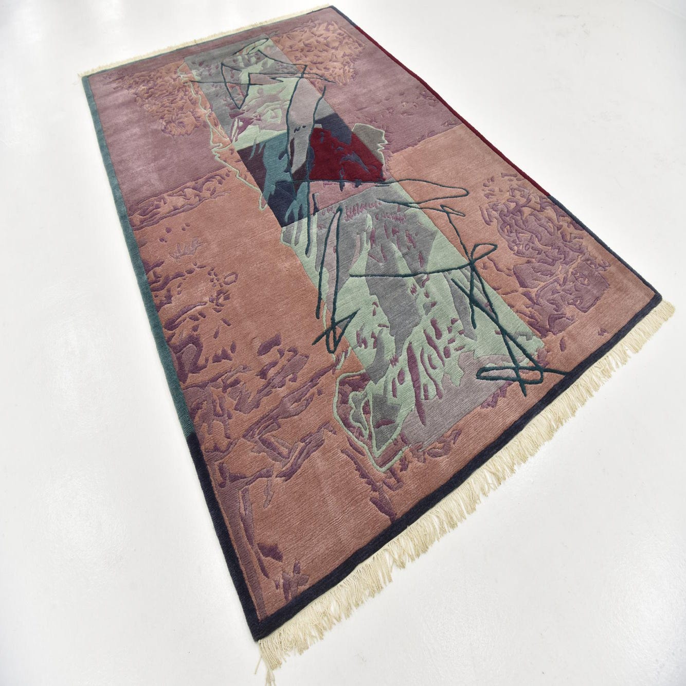 A 7x10 rectangular Nepal rug featuring a modern abstract design in various shades of purple, pink, teal, and gray.