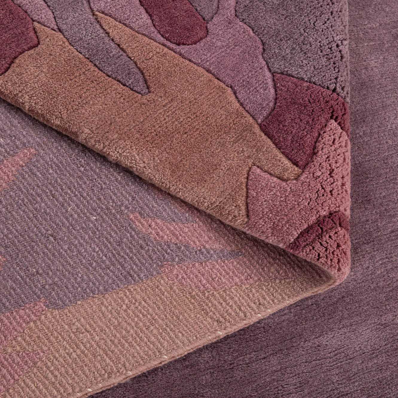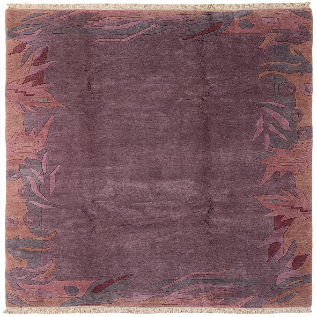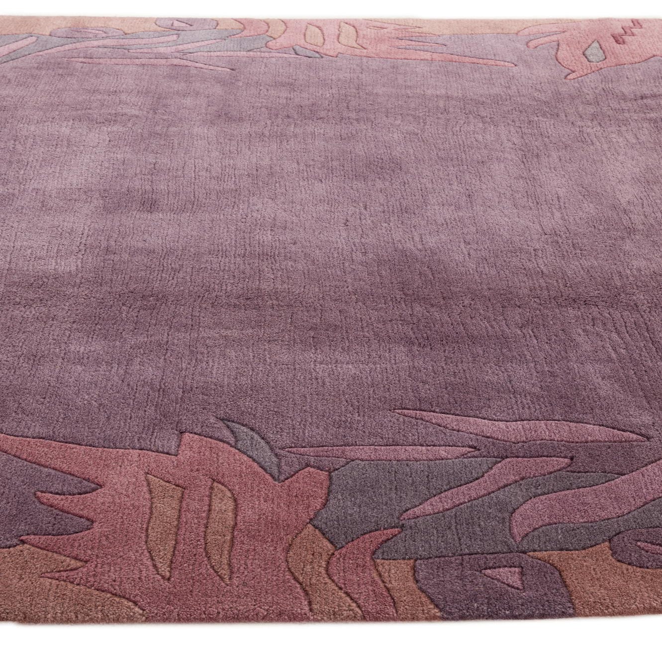 A 7x10 rectangular purple wool rug with a modern abstract border in shades of purple, pink, and grey.