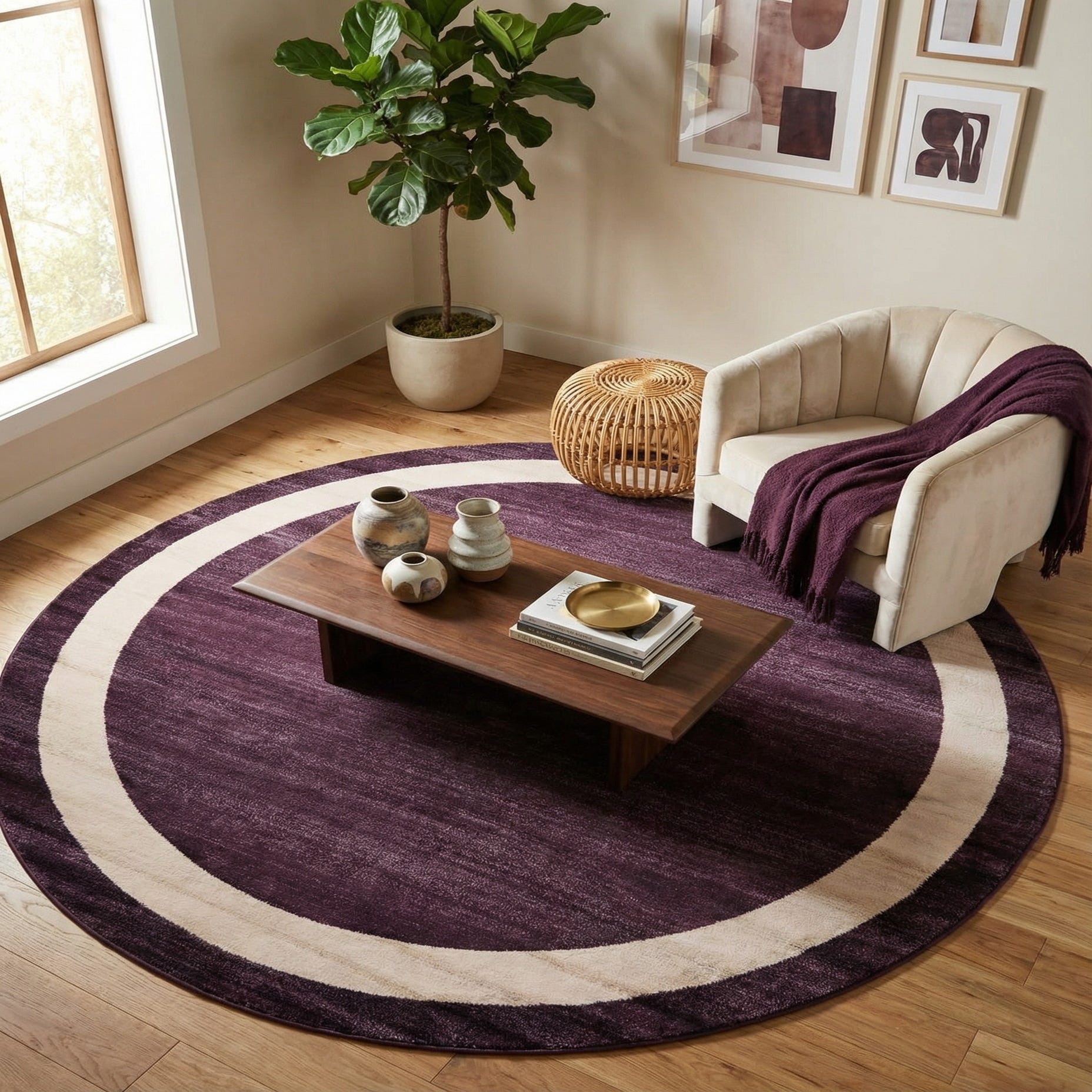 This rug works well as an anchor under a round coffee table in a modern living room or as a grounding element in a bedroom reading nook. It pairs nicely with neutral linens and warm wood tones, and can also complement brass or matte black accents for a more refined palette. The simple ring motif and rich violet background suit minimalist, transitional, or softly glam interiors where a bold color and clean shape are desired.