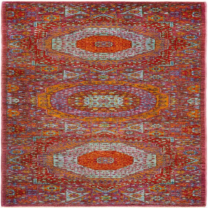 Primary color is Violet. Colors in this rug include: Violet, Violet, Blue, Red, Green, Yellow.