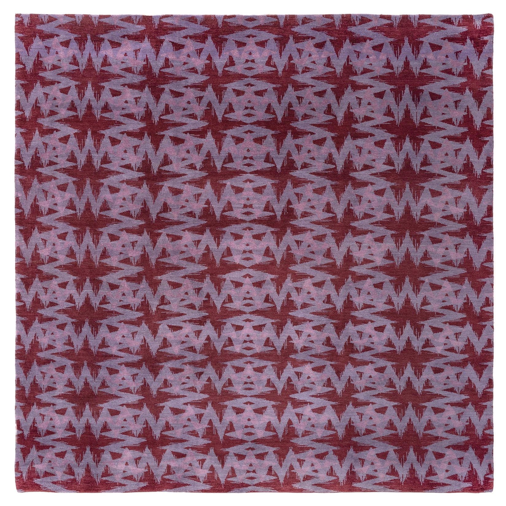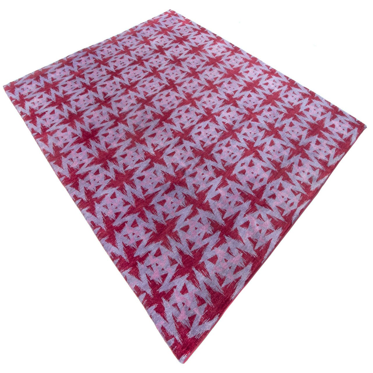 The Modern Manshu collection presents a hand-made 8x10 wool rug that is a testament to contemporary design and craftsmanship. A rich violet background sets the stage for a dynamic pattern featuring shades of red and pink. The design is characterized by a series of sharp geometric shapes that create a sense of movement and depth, making this piece a bold statement for any room.