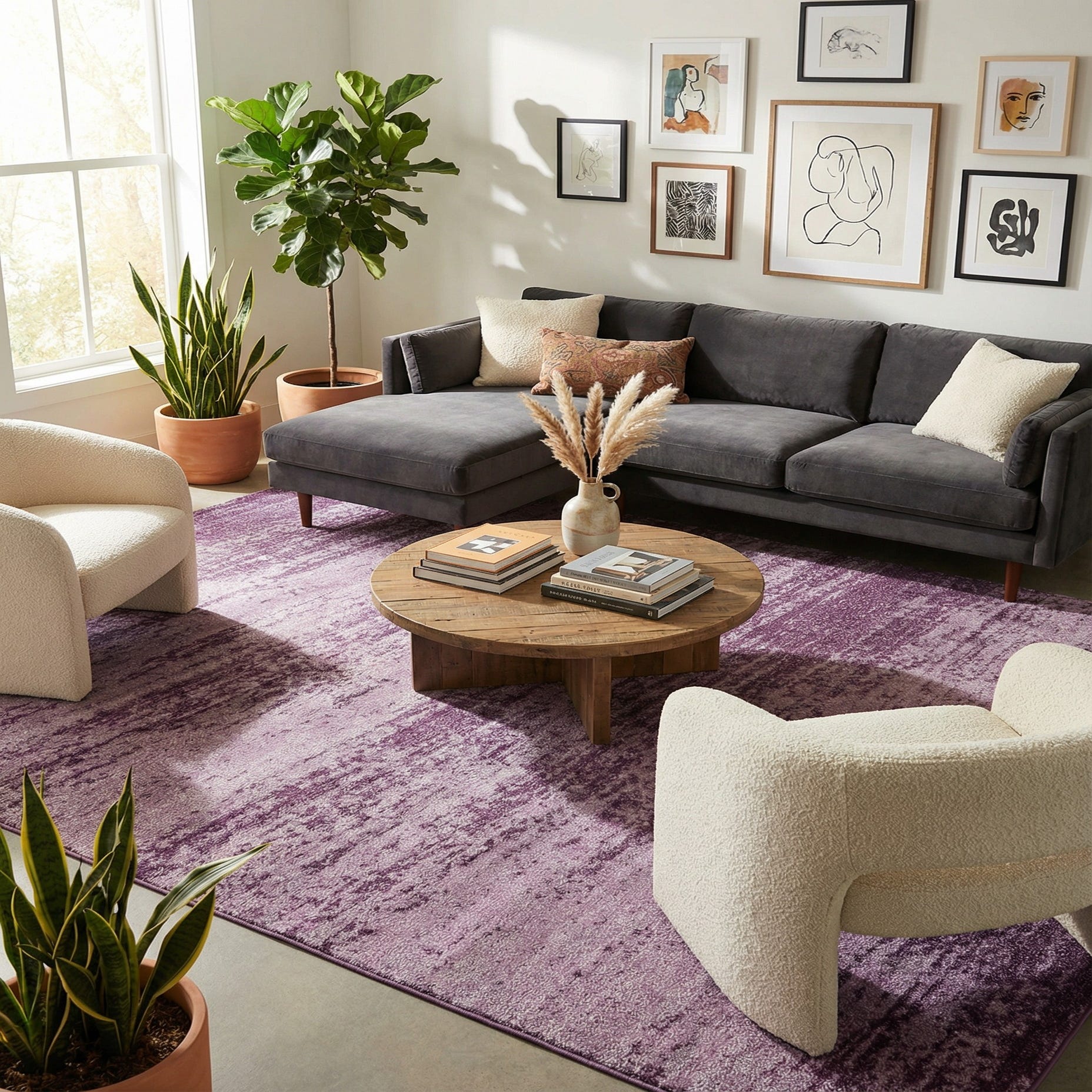 The Angelica collection presents a sophisticated 8x11 area rug, machine-woven from 100% polypropylene, ensuring durability and longevity. The rug showcases a rich violet background with a subtly distressed and gradational pattern that adds depth and character. Its plush texture offers a comfortable underfoot experience while maintaining a shed-free quality, ideal for high-traffic areas.